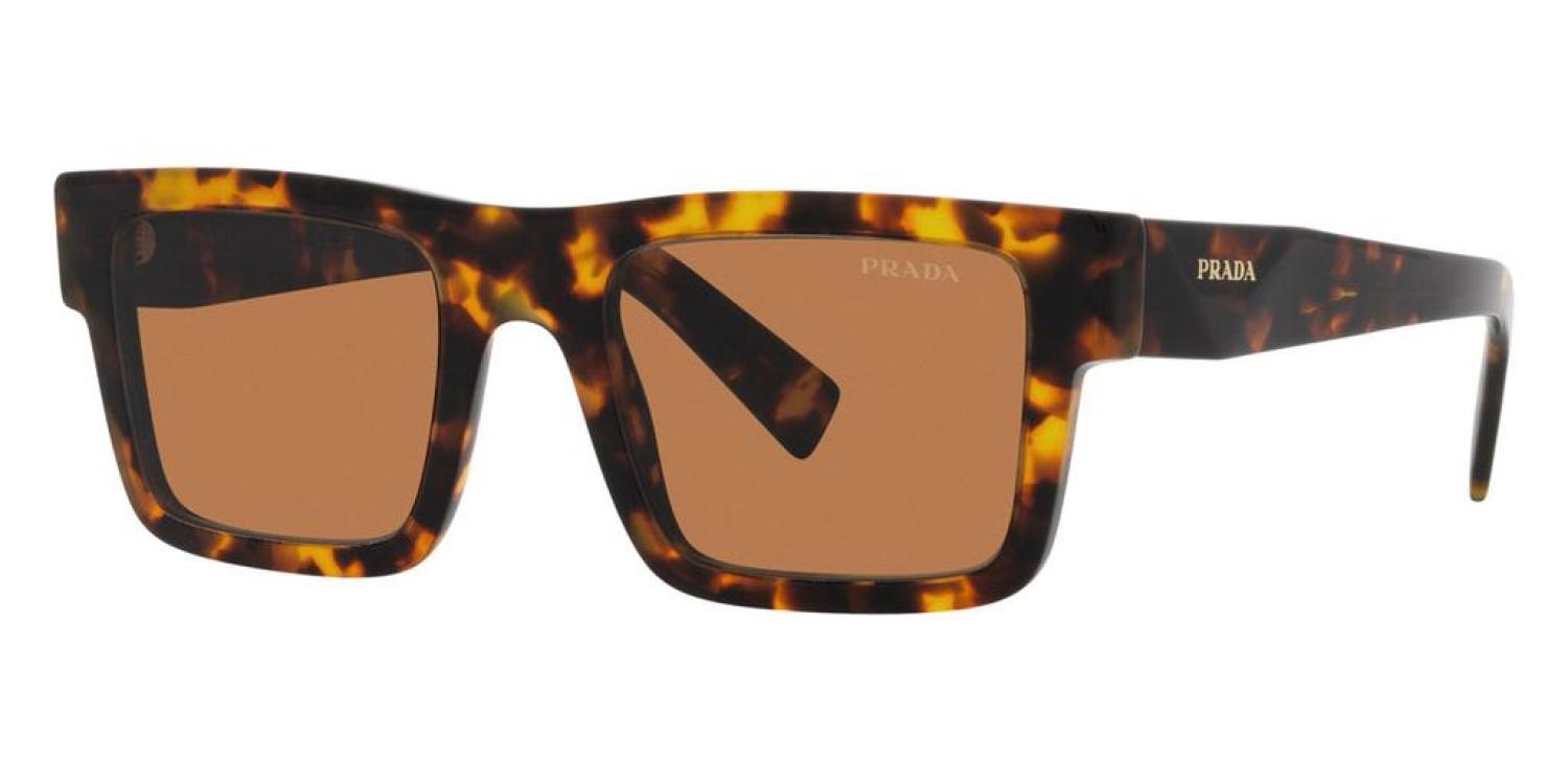 • The Prada men's Sunglasses measure at 52 mm lens width, 21 mm bridge width and 145 mm arm length. The frame is rectangular-shaped havana acetate and the lenses are non-polarized brown with 100% UV Protection. Made in Italy (PR-19WS-VAU2Z1)