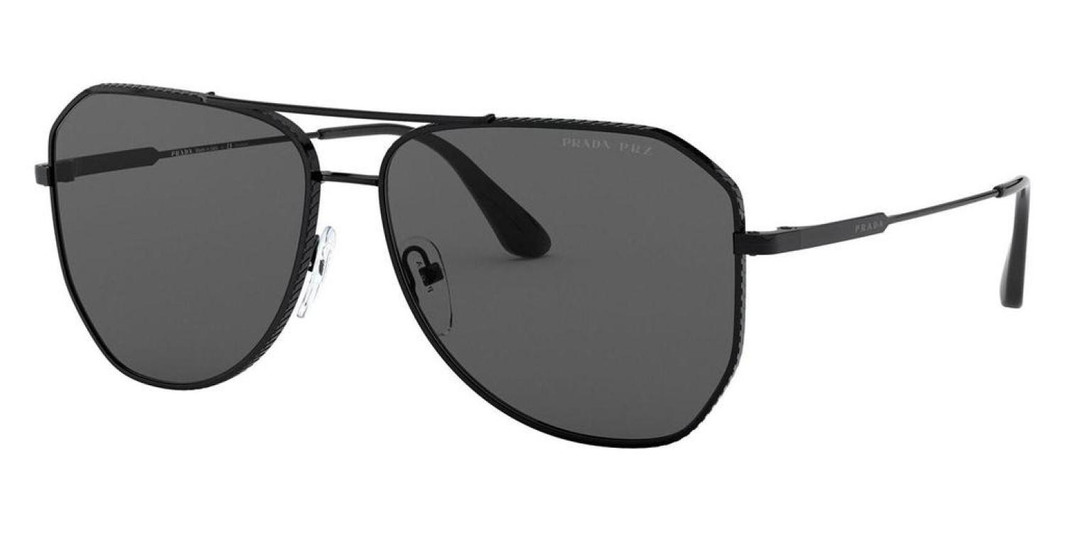 The Prada men's sunglasses measure at 61 mm lens width, 14 mm bridge width, 150 mm lens width. The frame is irregular-shaped black metal. Made In Italy (PR-63XS-1AB08G)
