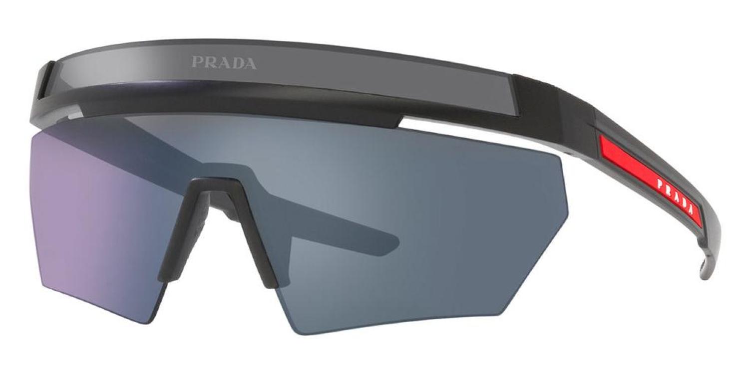 The Prada men's sunglasses measure at 44 mm lens width, 144 mm bridge width, 130 mm lens width. The frame is shield-shaped matte black plastic. Made In Italy (PS-01YS-1BO03U)