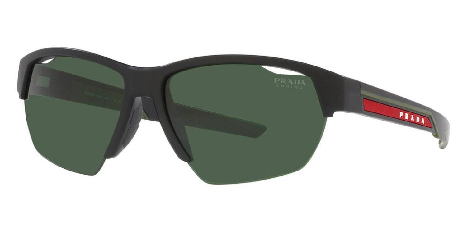 The Prada men's sunglasses measure at 64 mm lens width, 15 mm bridge width, 140 mm lens width. The frame is irregular-shaped matte black plastic. Made In Italy (PS-03YS-18G06U)