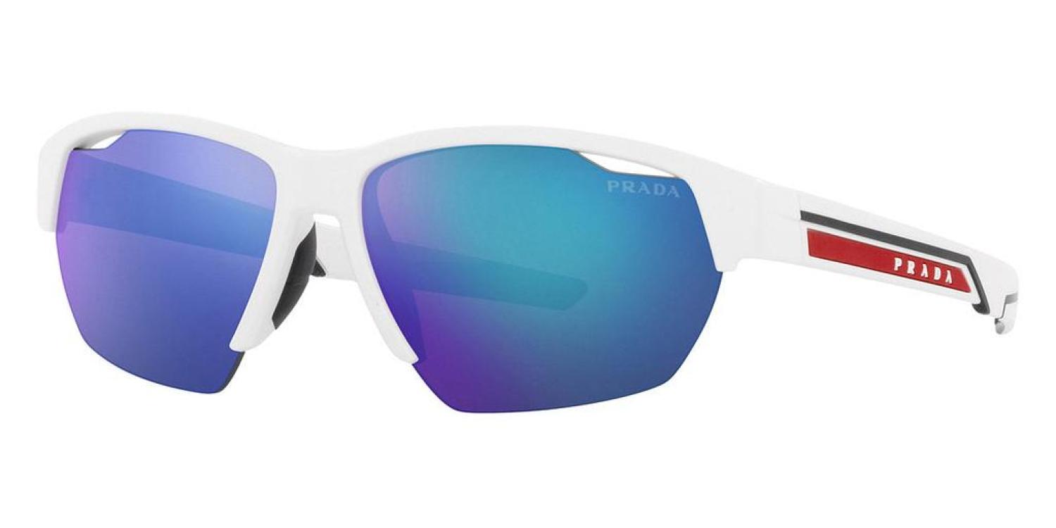 The Prada men's sunglasses measure at 64 mm lens width, 15 mm bridge width, 140 mm lens width. The frame is irregular-shaped matte white plastic. Made In Italy (PS-03YS-AAI08R)