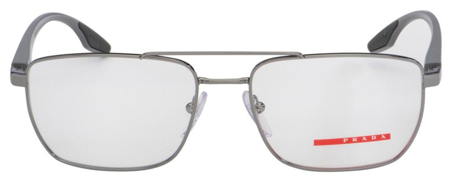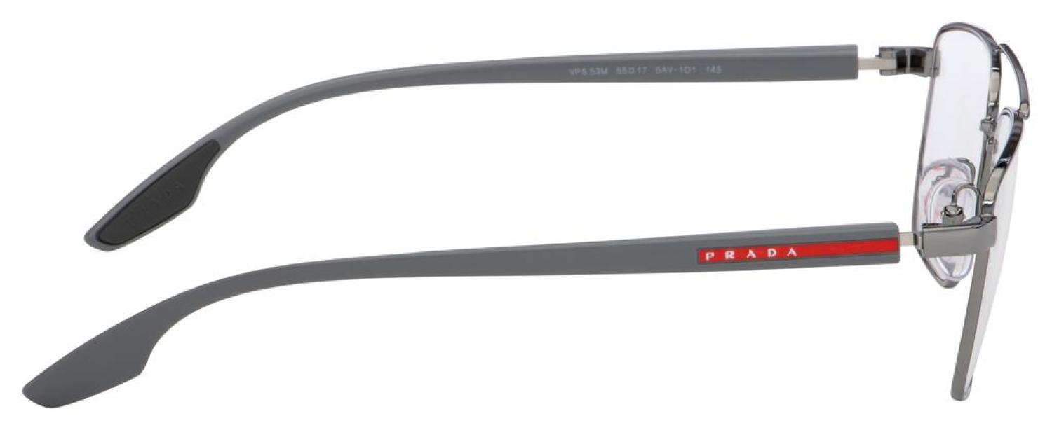The Prada men's Opticals measure at 55 mm lens width, 17 mm bridge width and 145 mm arm length. The frame is rectangular-shaped gunmetal metal and plastic. Made in Italy (PS53MV-5AV1O1-55)