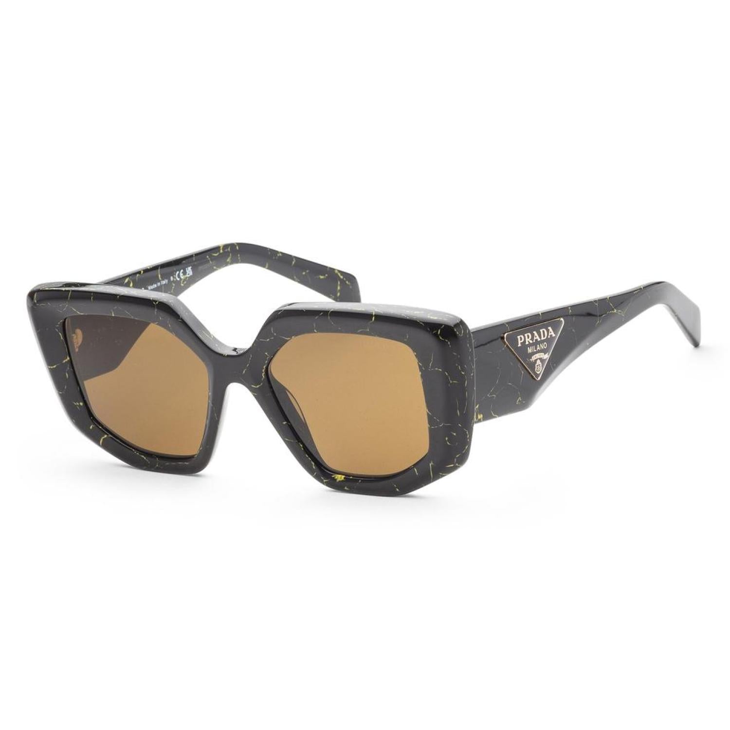 Dimensions - 50 mm x 18 mm x 140 mm. The frame is acetate geometric shape. The lenses are dark brown and the frame is black/yellow marble. (PR-14ZS-19D01T)