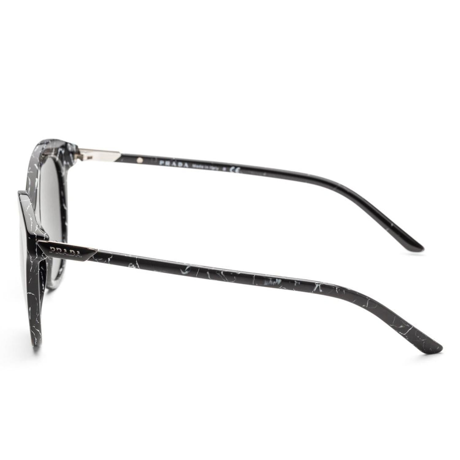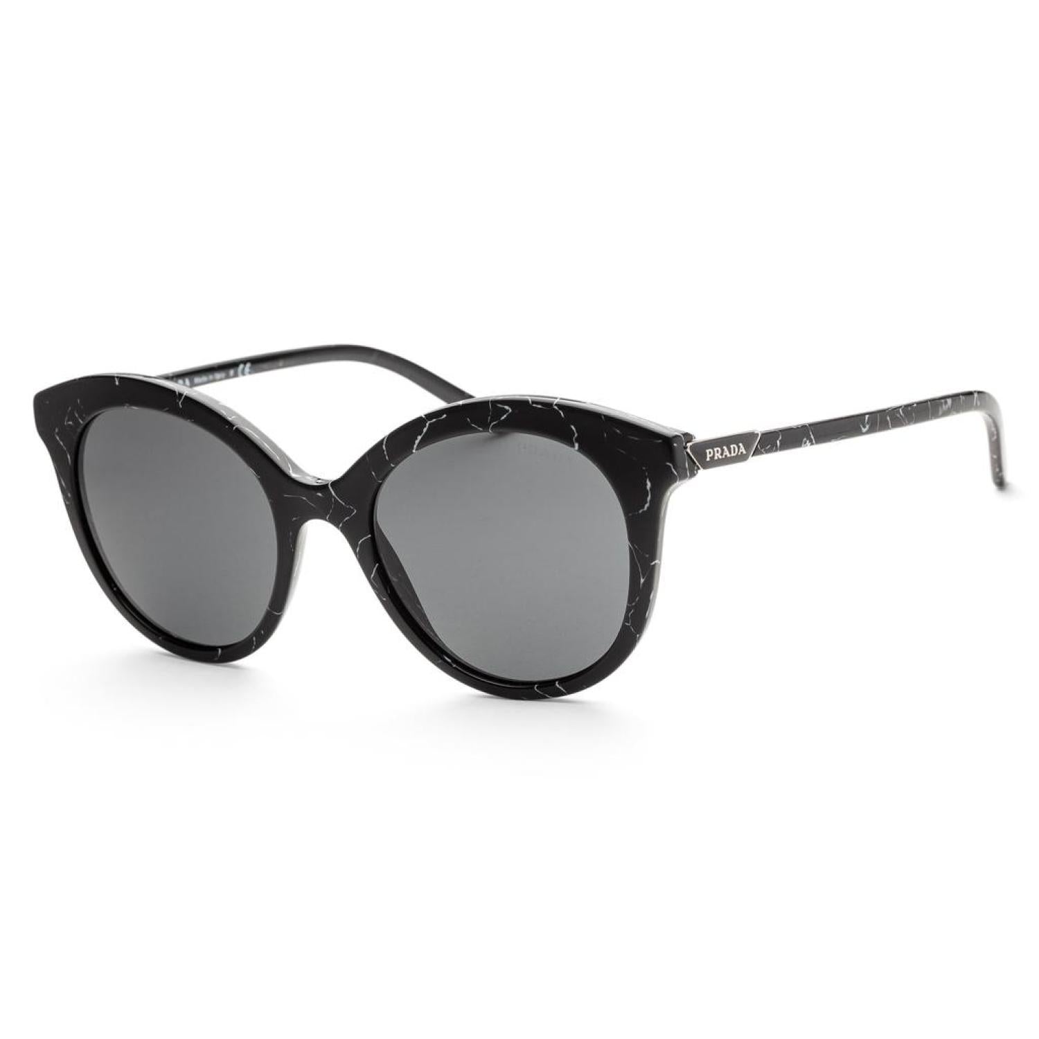 • The Prada women's sunglasses measure at a 51 mm lens width, 19 mm bridge width, and 140 mm arm length. The frame is round-shaped black marble acetate. The lenses are non-polarized dark grey. Made in Italy. (PR02YS-03Y5S0-51)
