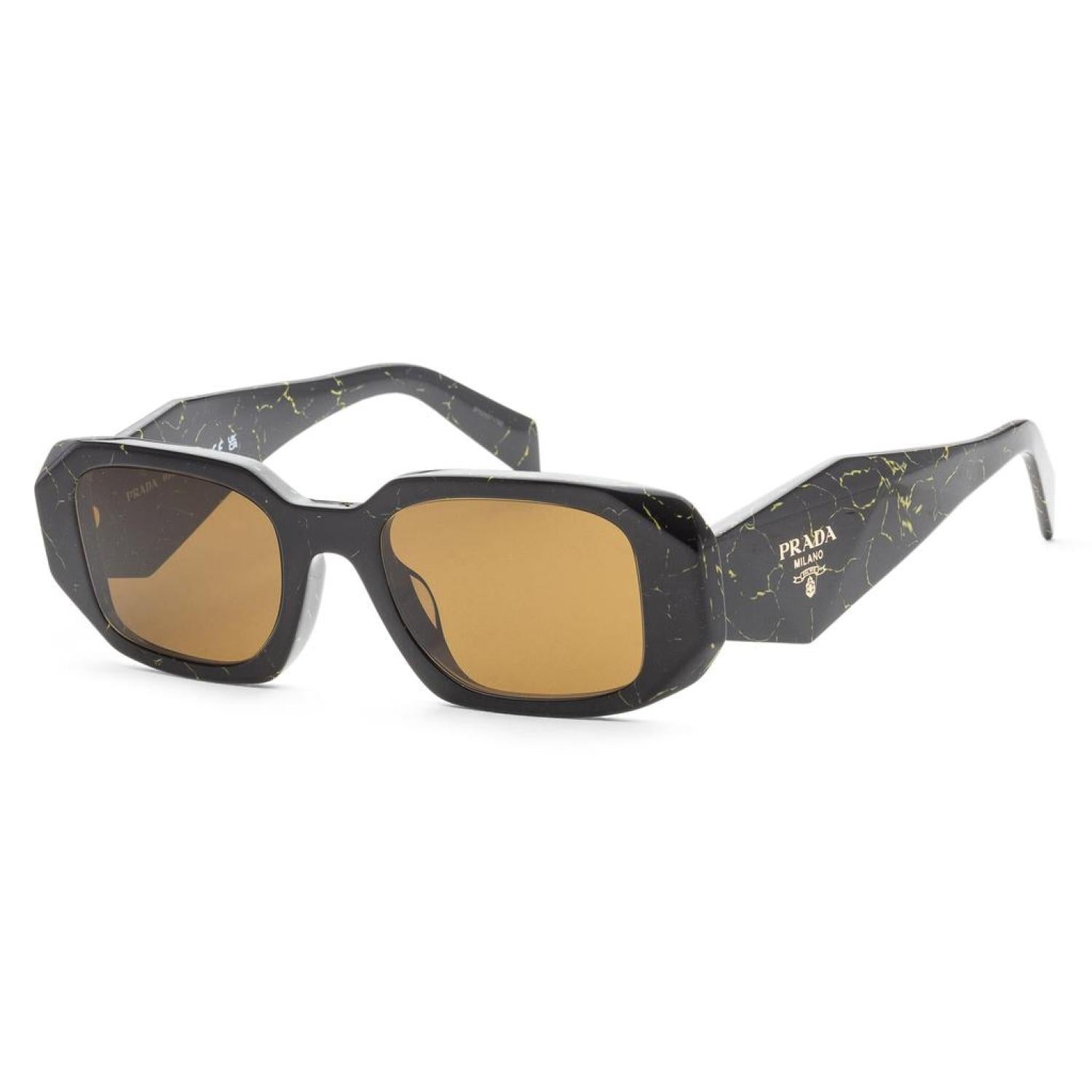 Dimensions - 51 mm x 20 mm x 145 mm. The frame is black/yellow marble acetate rectangular shape. The lenses are dark brown non-polarized with 100% UV Protection. (PR-17WSF-19D01T)