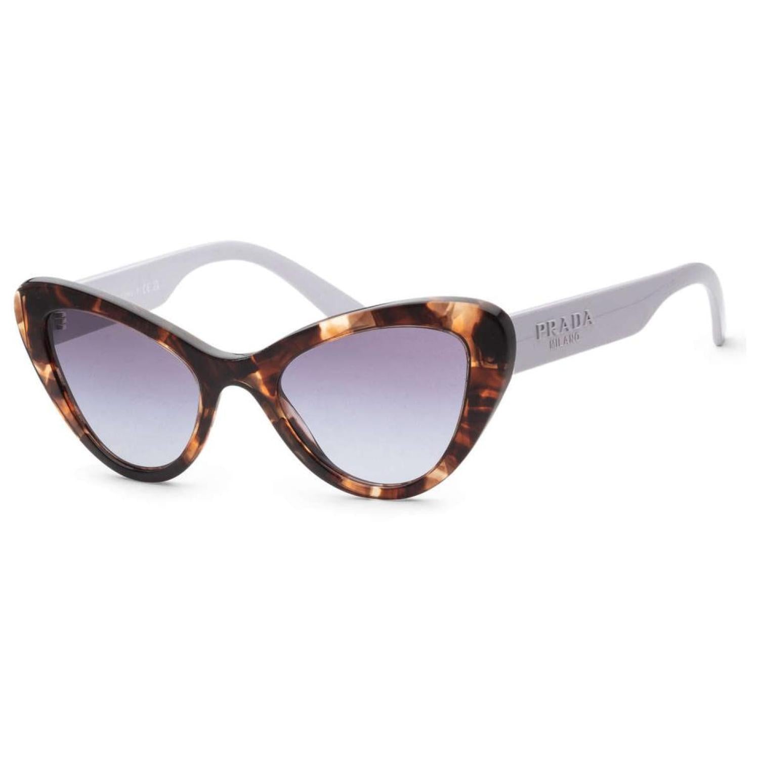 Dimensions - 52 mm x 21 mm x 140 mm. The frame is acetate cat-eye shape. The lenses are light violet gradient blue and the frame is havana. (PR-13YS-07R08I)