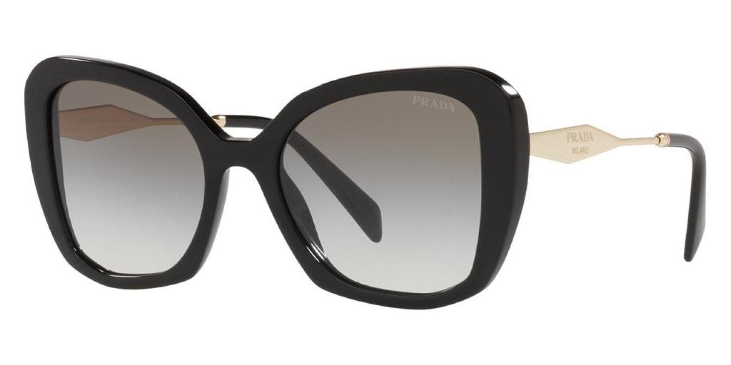 The Prada women's sunglasses measure at a 53 mm lens width, 19 mm bridge width, and 140 mm arm length. The frame is butterfly-shaped black acetate. The lenses are non-polarized grey gradient. Made in Italy. (PR-03YS-1AB0A7)