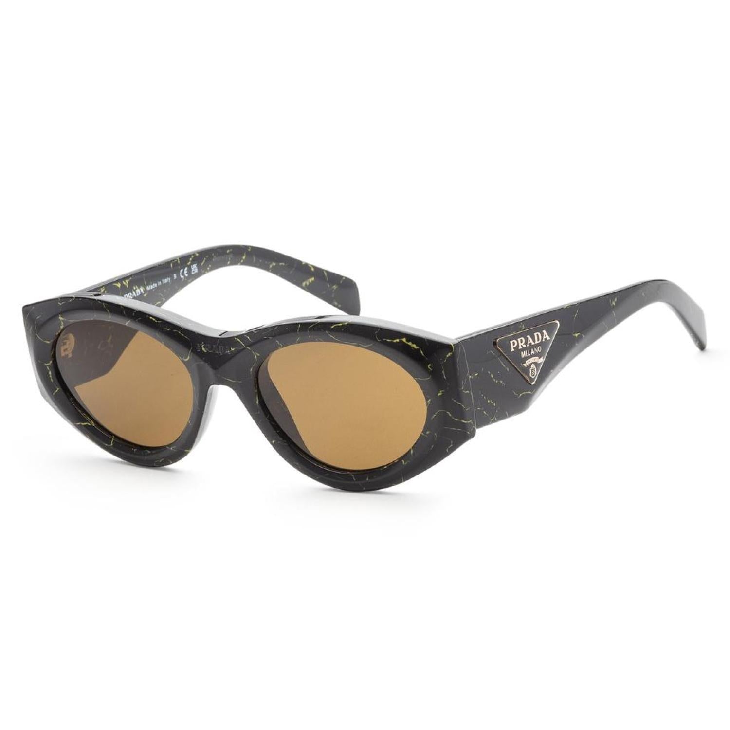 Dimensions - 53 mm x 20 mm x 140 mm. The frame is acetate oval shape. The lenses are dark brown and the frame is black yellow marble. (PR-20ZS-19D01T)