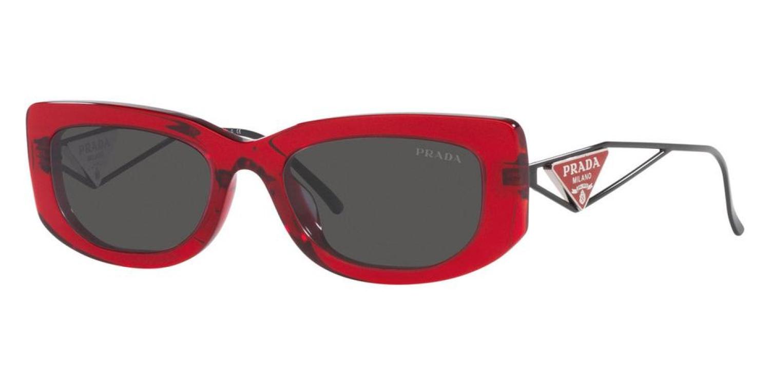 Dimensions - 53 mm x 19 mm x 140 mm. The frame is acetate rectangular shape. The lenses are dark grey and the frame is crystal fire. (PR-14YS-08Z5S0)