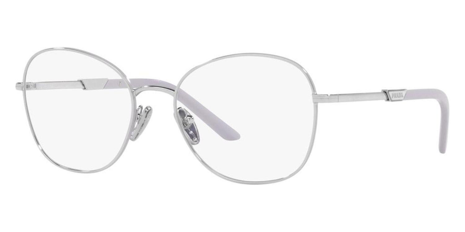 The Prada women's opticals measure at 54mm lens width, bridge width, and 135mm arm length. The frame is round-shaped silver/wisteria. (PR-64YV-15A1O1-54)