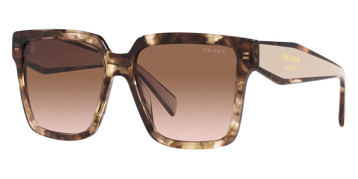 The Prada women's sunglasses measure at a 56 mm lens width, 16 mm bridge width, and 140 mm arm length. The frame is round-shaped caramel tortoise metal. The lenses are non-polarized brown gradient. Made in Italy. (PR-24ZS-07R0A6-56)