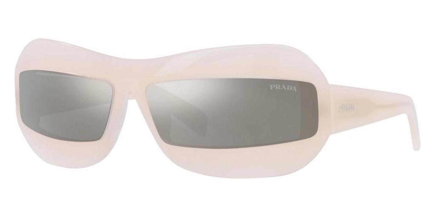 The Prada women's sunglasses measure at a 68 mm lens width, 13 mm bridge width, and 120 mm arm length. The frame is irregular-shaped opal nude acetate. The lenses are non-polarized light grey mirror silver. Made in Italy. (PR-30YS-13D2B0-68)