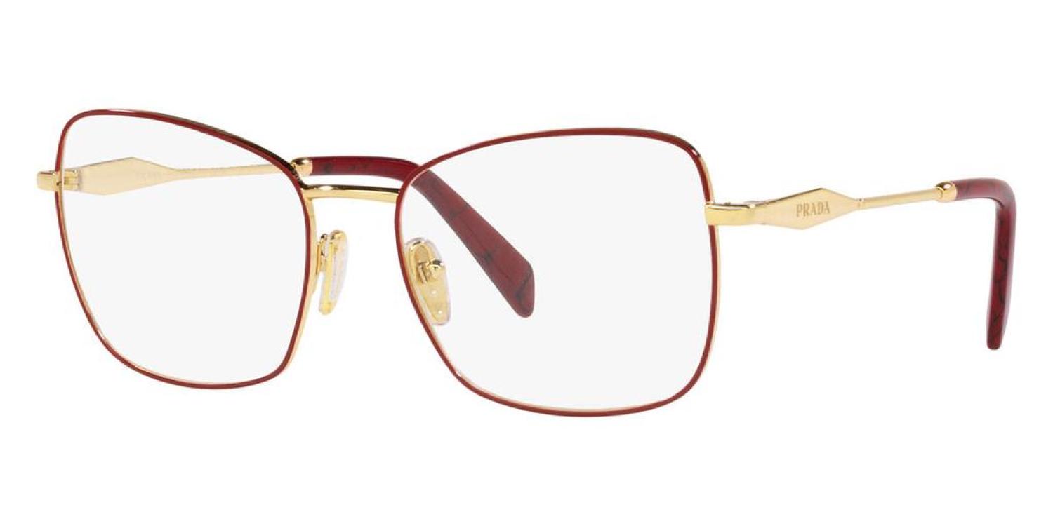 The Prada women's Opticals measure at 56 mm lens width, 18 mm bridge width and 140 mm arm length. The frame is pillow-shaped red and gold metal. Made in Italy (PR-53ZV-12F1O1-56)