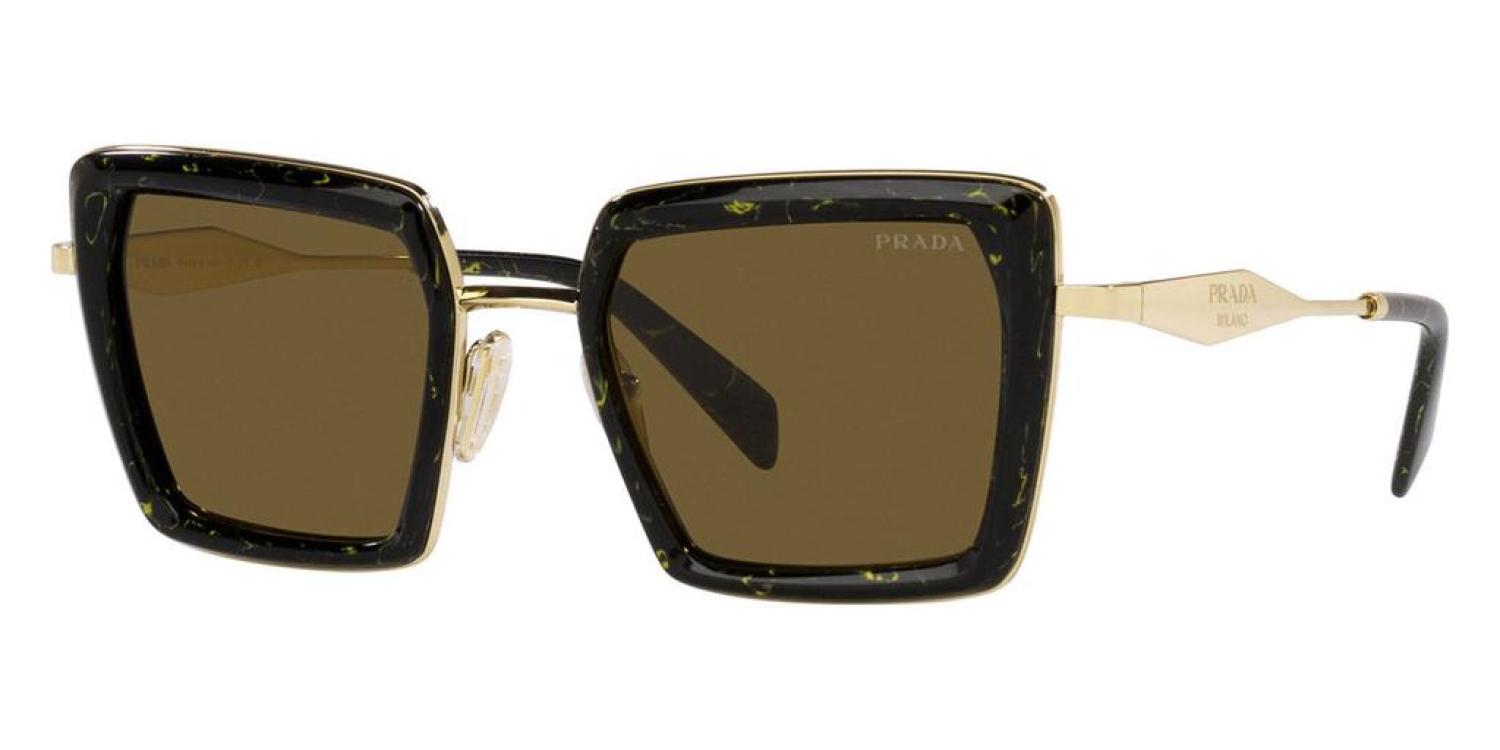 The Prada women's sunglasses measure at 52 mm lens width, 22 mm bridge width, 140 mm lens width. The frame is pillow-shaped black/yellow marble metal. Made In Italy (PR-55ZS-19D01T)