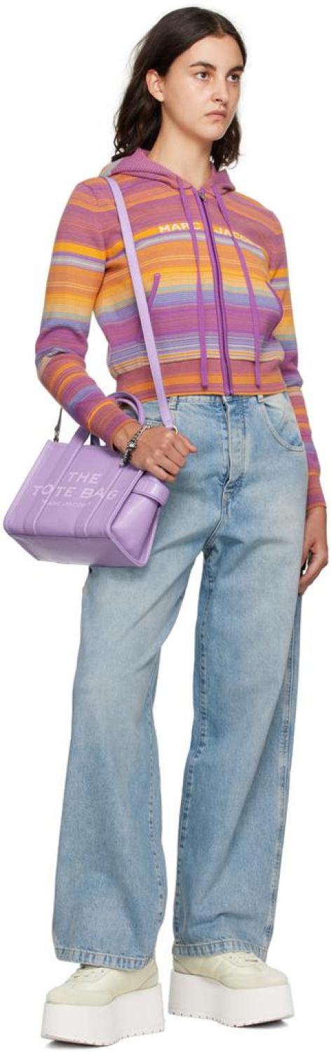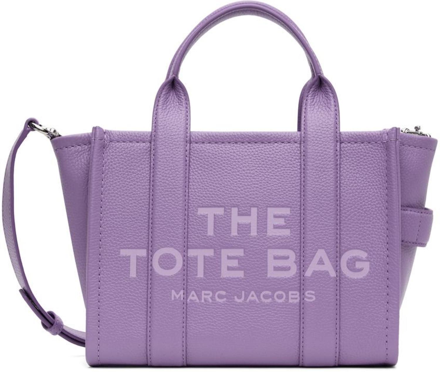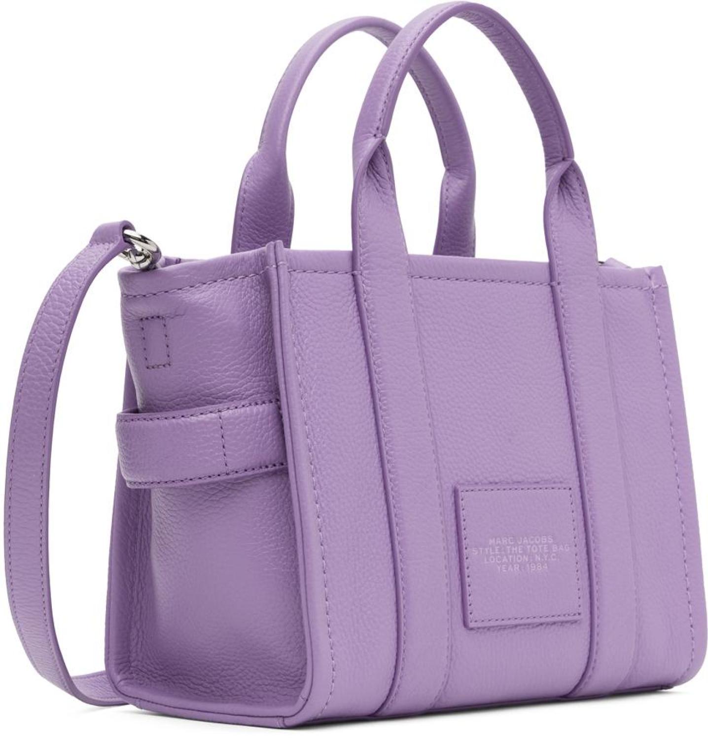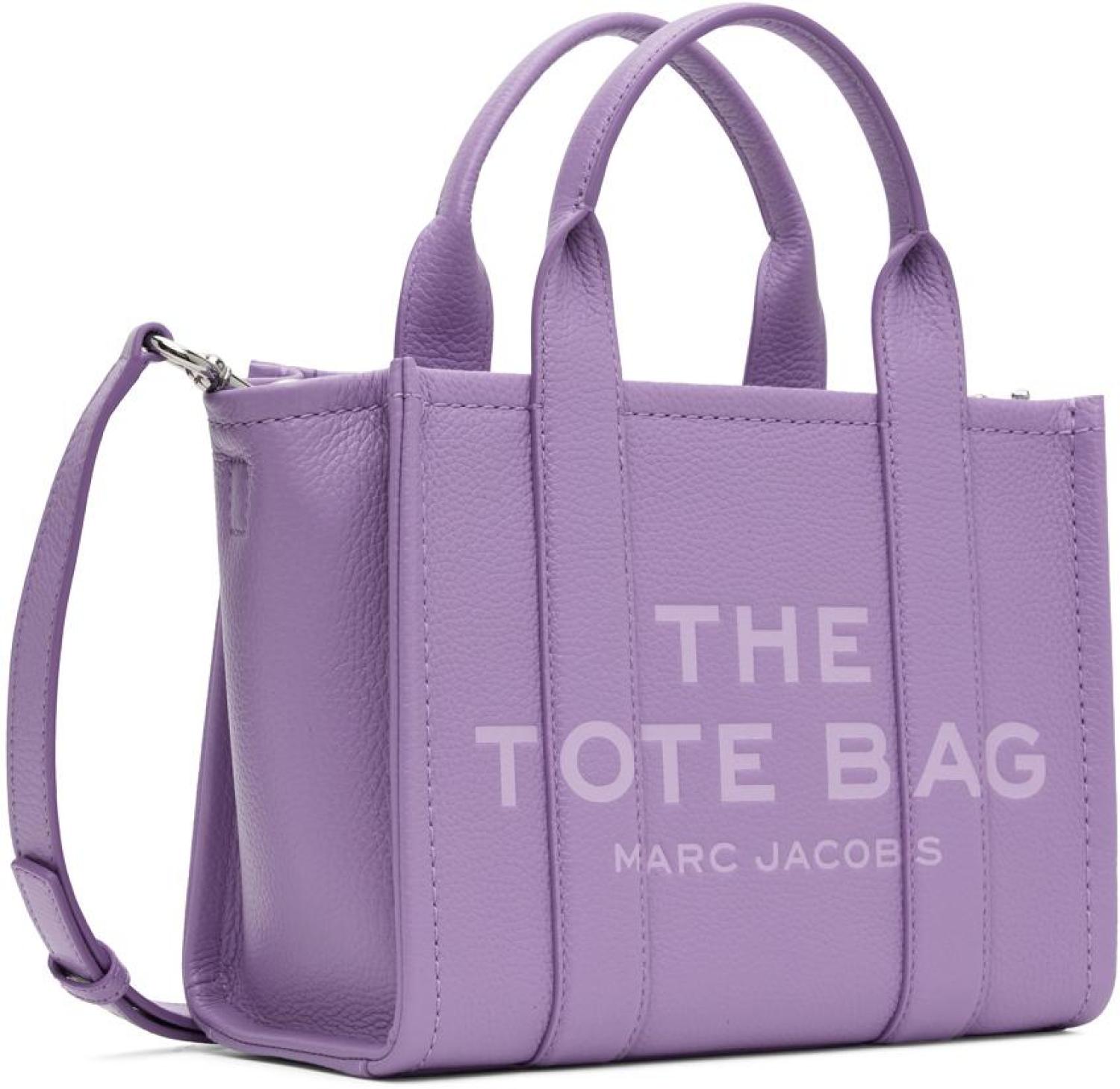 Marc Jacobs Purple 'The Leather Small Tote Bag' Tote Grained leather tote in purple. · Twin carry handles · Detachable pin-buckle shoulder strap · Carry handle at side · Logo embossed at face · Logo patch at back face · Zip closure · Patch pocket at interior · Partial twill lining · H7.5 x W10 x D5 in Supplier color: Lavender Leather. Made in Viet Nam. 232190F049134