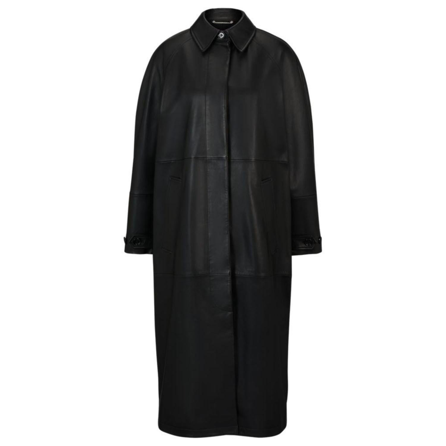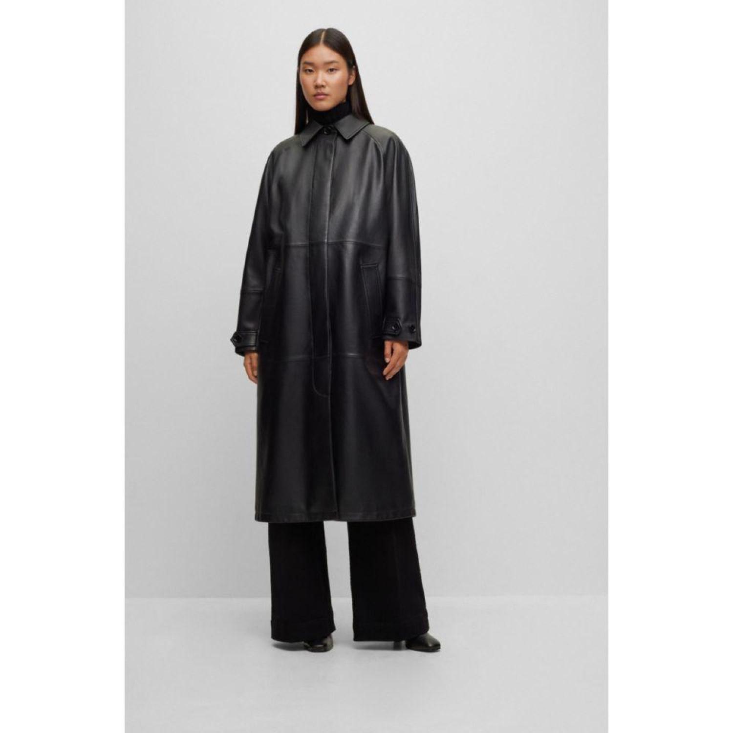 An elegant coat by BOSS Womenswear, cut to a relaxed fit in Nappa leather with a concealed closure and side slash pockets.