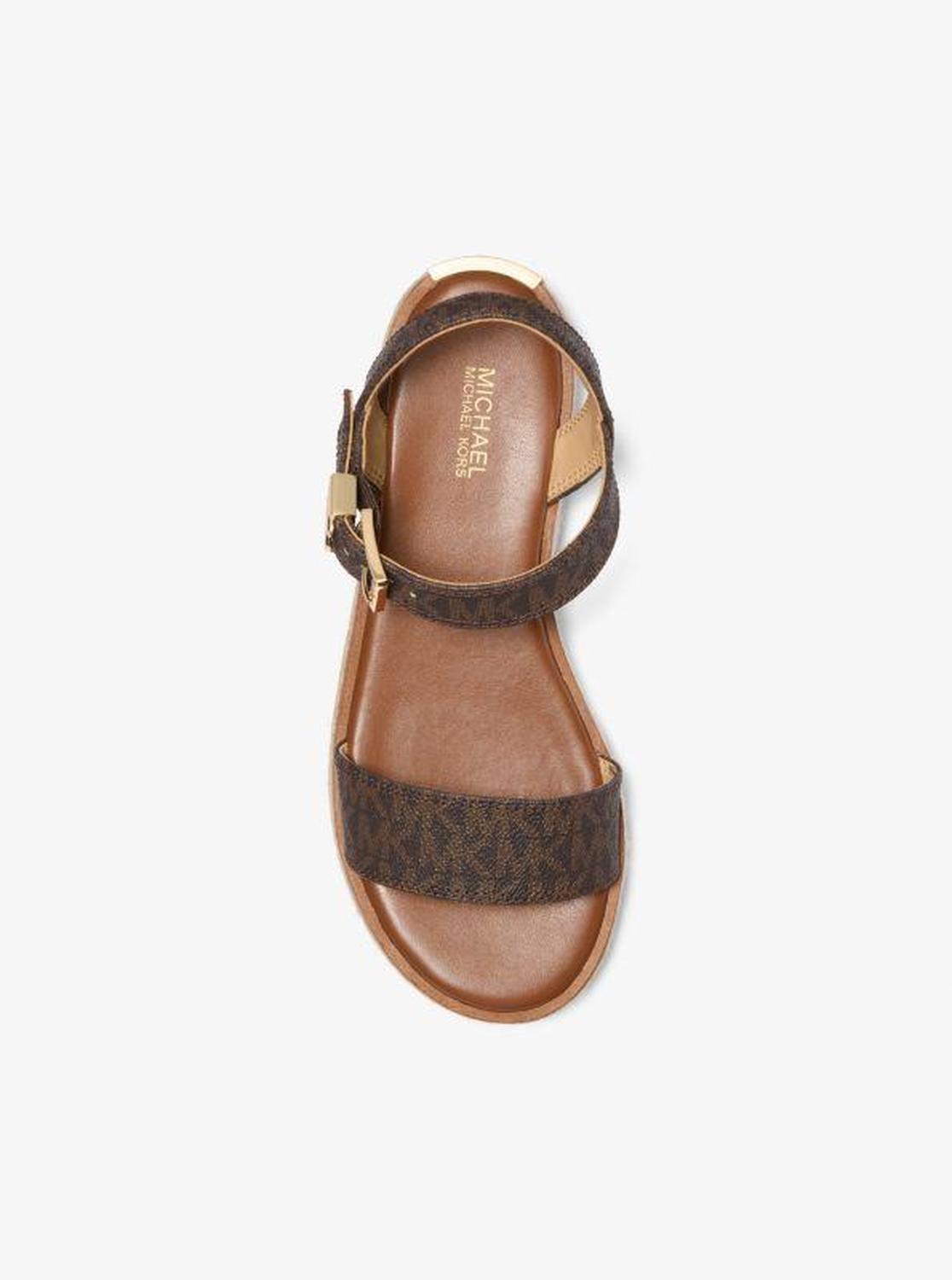 • Strut into summer with the perfect shoe for every occasion. Finished with our “MK” initial hardware, the Richie sandal is crafted from Signature logo-print canvas and set on a woven jute platform for a bohemian twist. We love how the ankle strap and chunky sole combine to create the illusion of longer legs.