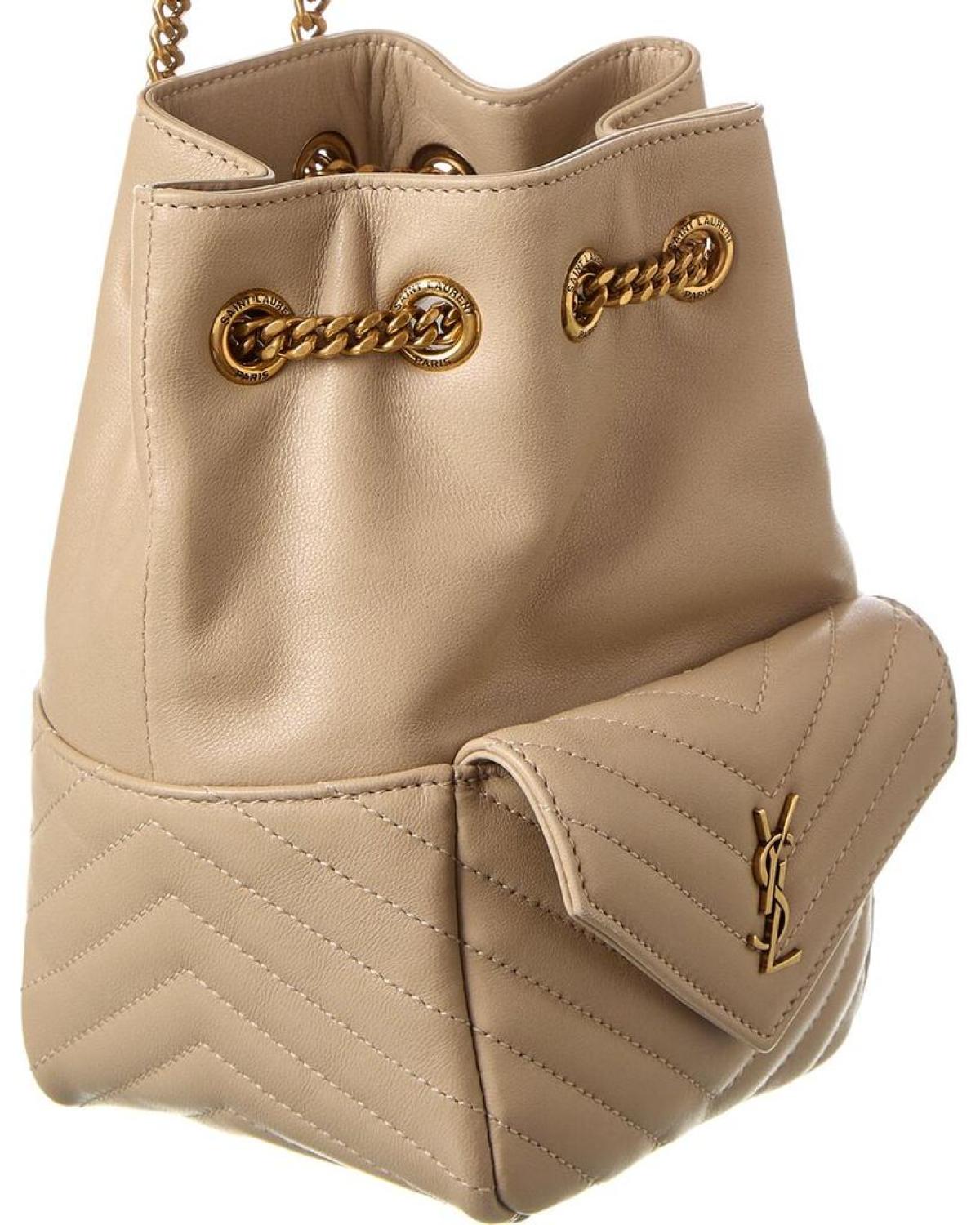 • Introducing the Saint Laurent Joe Mini Quilted Leather Bucket Bag, a luxurious addition to your handbag collection. As part of the iconic Saint Laurent brand, this bag exudes modern glam and Tres Chic style.Crafted in Italy, this Joe Mini Bucket Bag showcases exquisite beige quilted leather and is adorned with gold-tone hardware, including a stunning monogram accent and flap pocket. Its interior is lined with a soft fabric and features a convenient interior pocket for your valuables.Measuring 5 inches wide by 7.5 inches high by 5 inches deep, this compact bag is perfect for carrying your essentials. The shoulder strap drops 17 inches, allowing for comfortable crossbody or shoulder wear.With a drawstring closure, this bag offers both functionality and style, ensuring that your belongings are secure while adding a fashionable touch to any outfit. Please note that all measurements were taken by hand and are approximate, so slight variations may occur.Rest assured, all our products, including this Saint Laurent Joe Mini Bucket Bag, are 100% genuine. While we occasionally source merchandise from trusted independent suppliers, we stand by the authenticity of every product sold on our site. Elevate your style with this exquisite Saint Laurent handbag and experience the epitome of luxury.