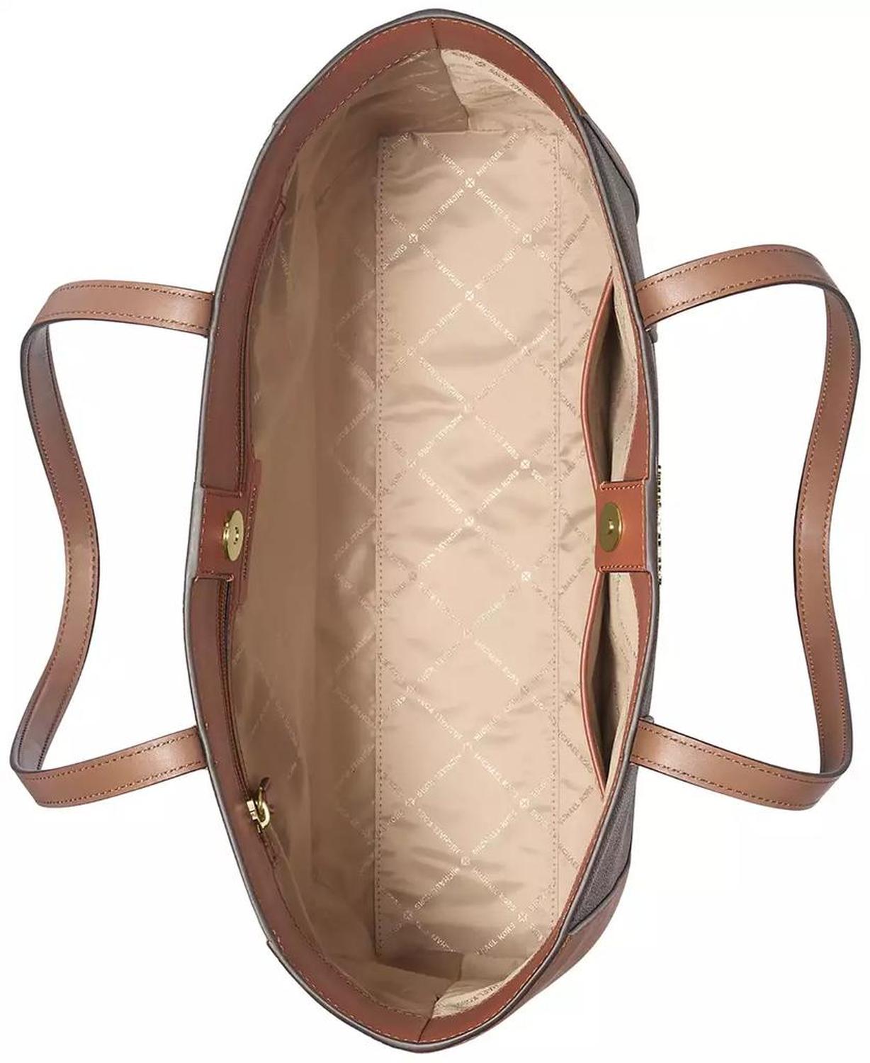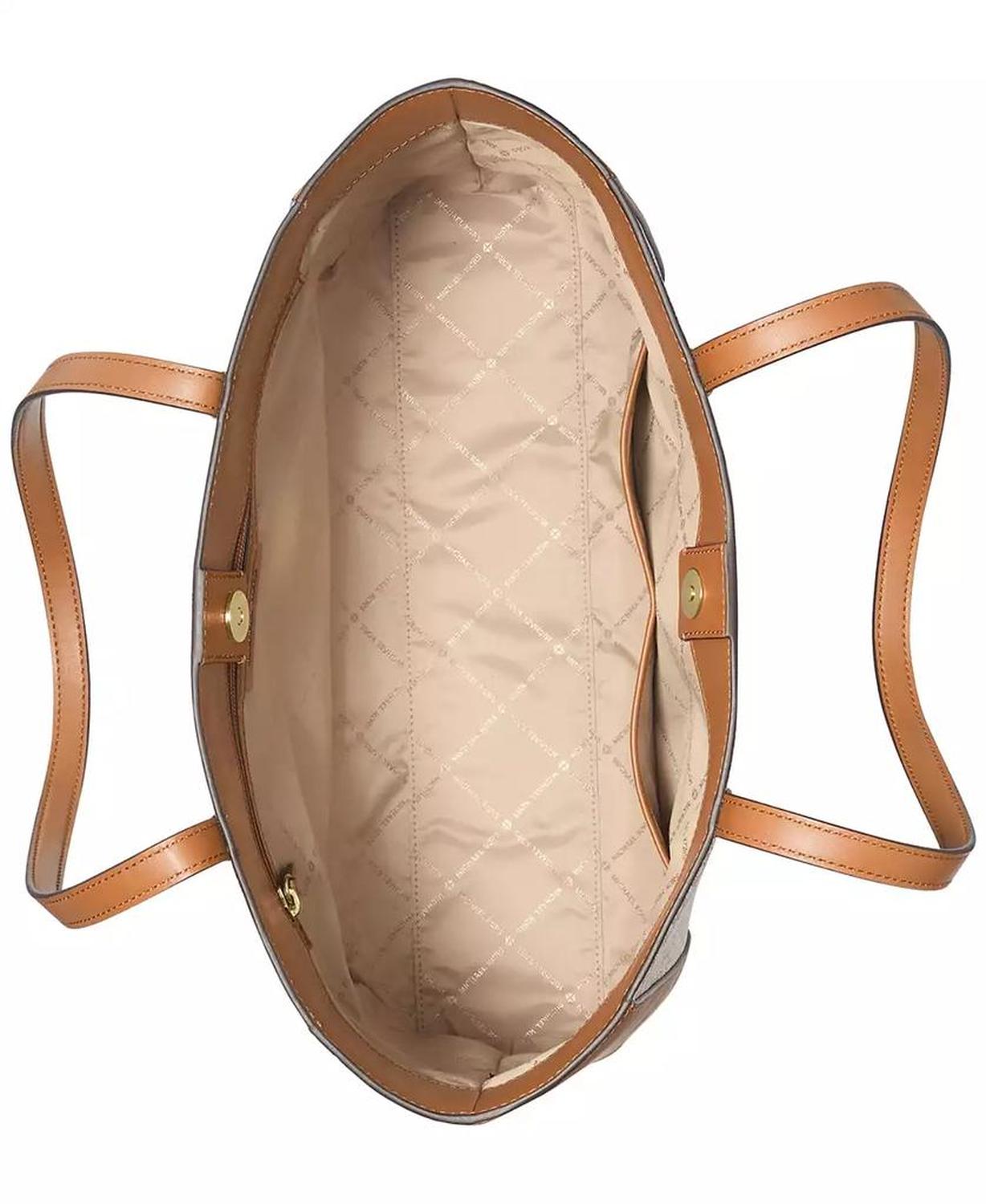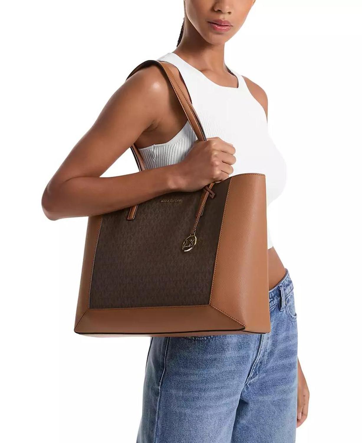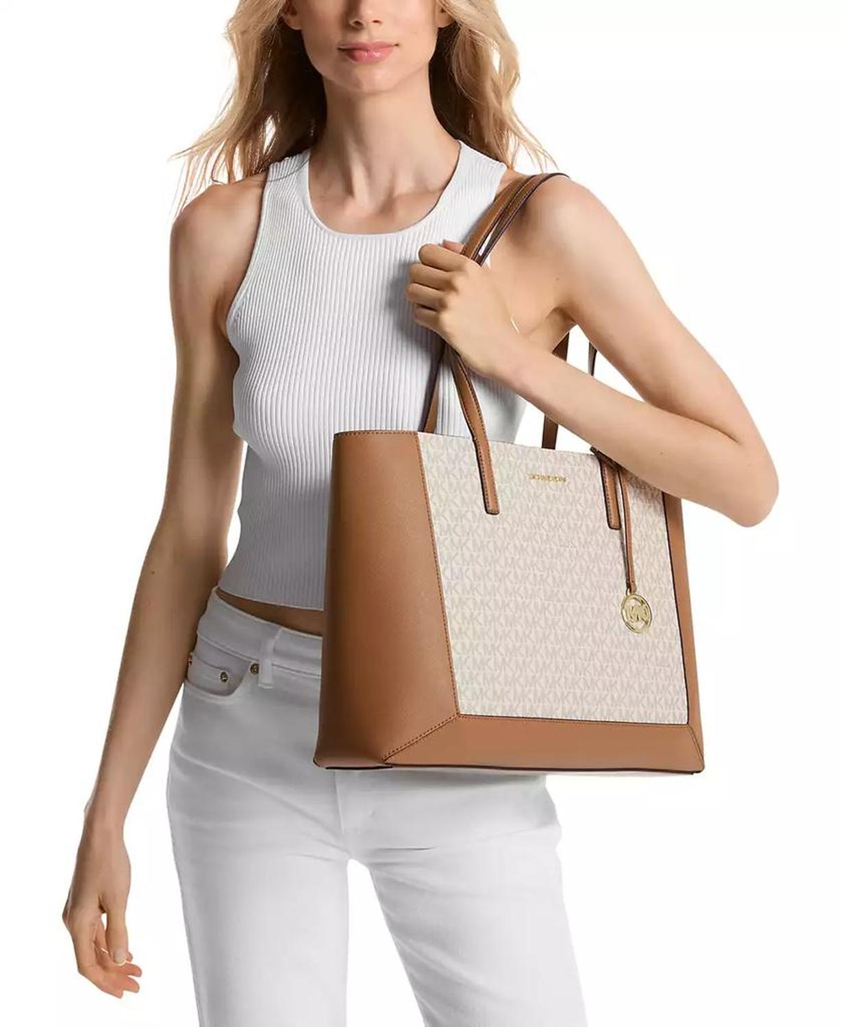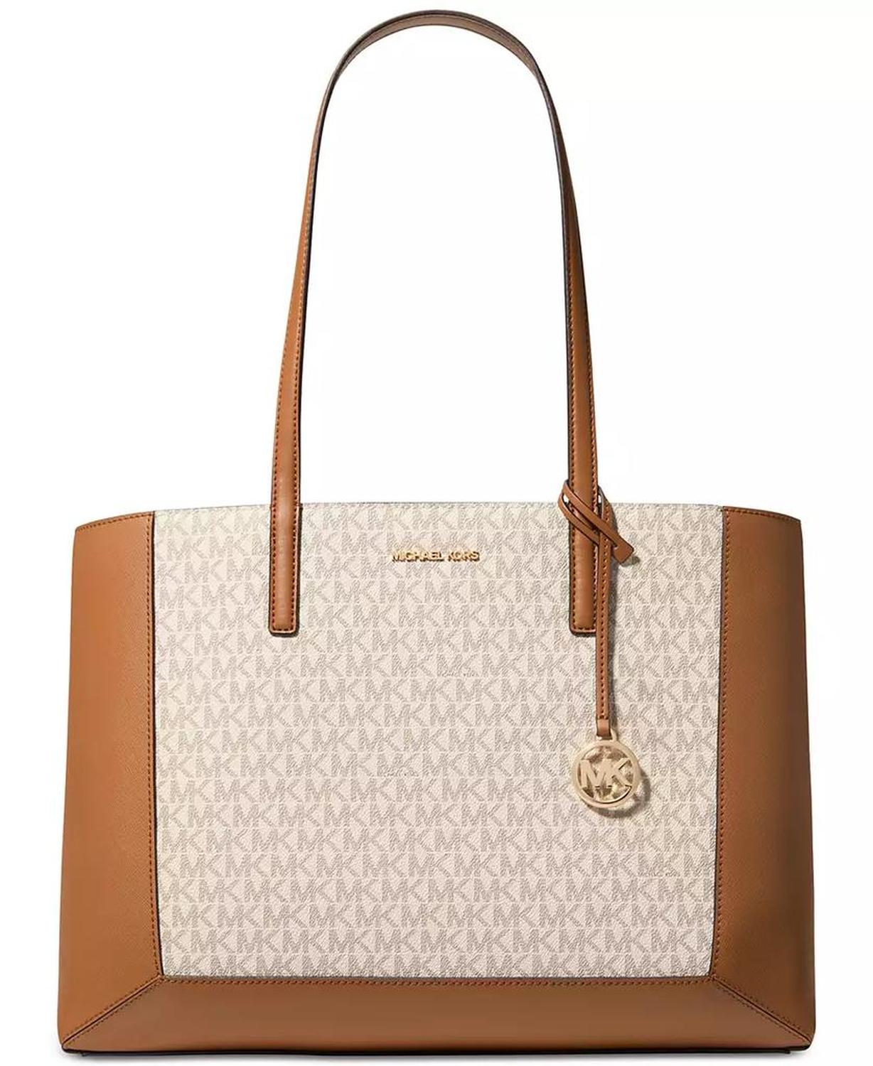 • Sized for busy days with a convenient snap closure, this timeless tote by MICHAEL Michael Kors features iconic monogram and a shiny gold-tone logo charm.