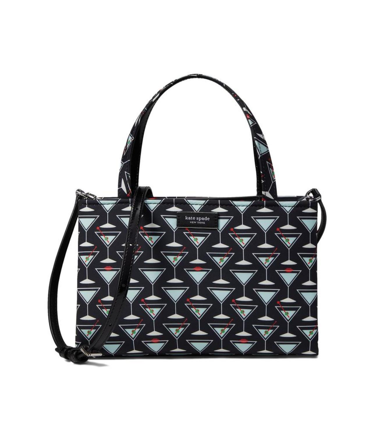 Let your confidence be on top  carrying the   Kate Spade New York® Sam Icon Martini Printed Fabric Small Tote. This handbag features the magnetic snap closure, one main compartment, and two handles.