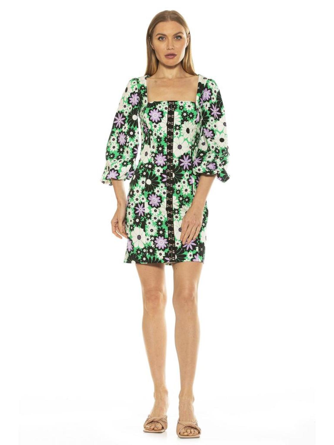 PRODUCT FEATURES Sheath Dress Illusion sheer panel Square neck Short puff sleeves Hook and eye front Woven 97% Cotton, 3% Spandex 100% Polyester Machine wash cold, tumble dry or line dry Imported Style D3429