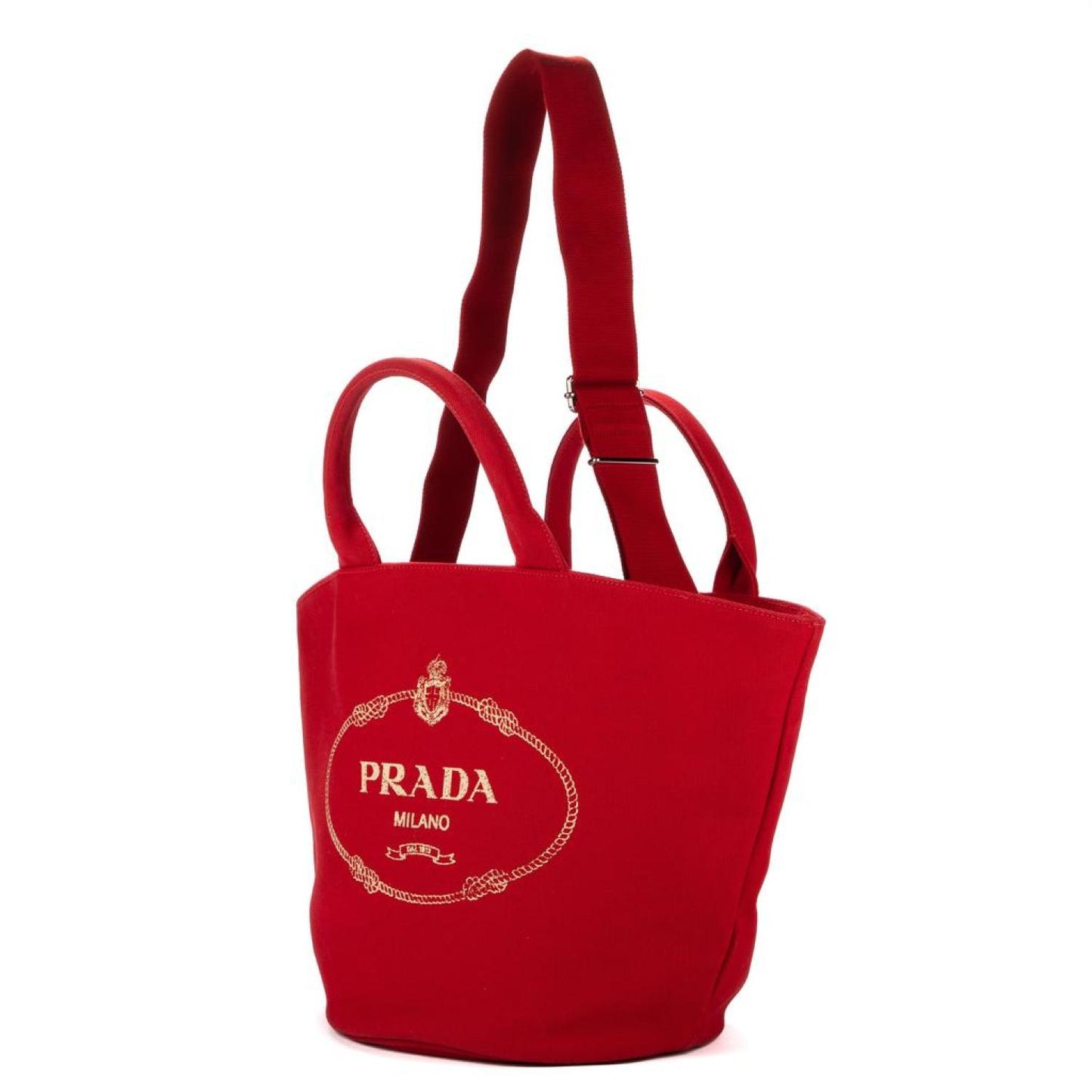 Prada Handbag in Red Canvas Fabric and Silver hardware. Dimensions - 34*28*9cm. Serial number - N/A. Inclusions - Strap, Pouch. Pre-Owned