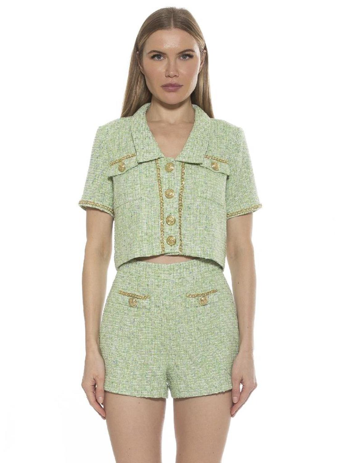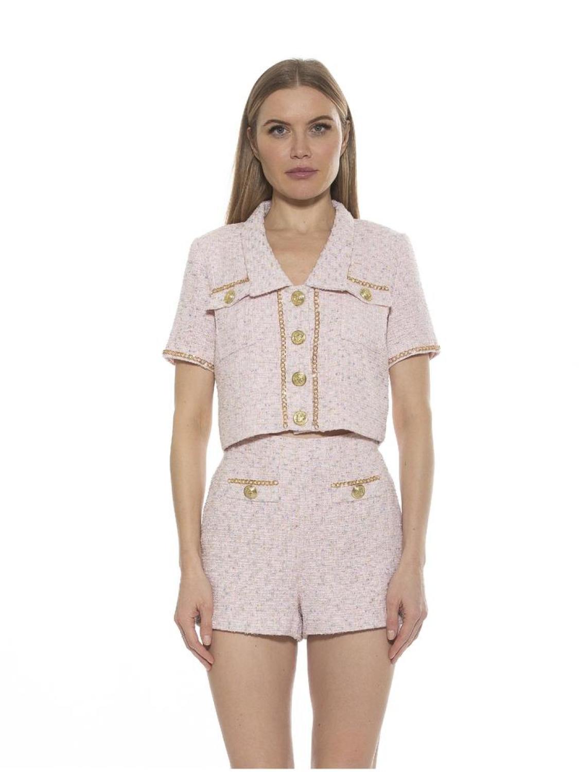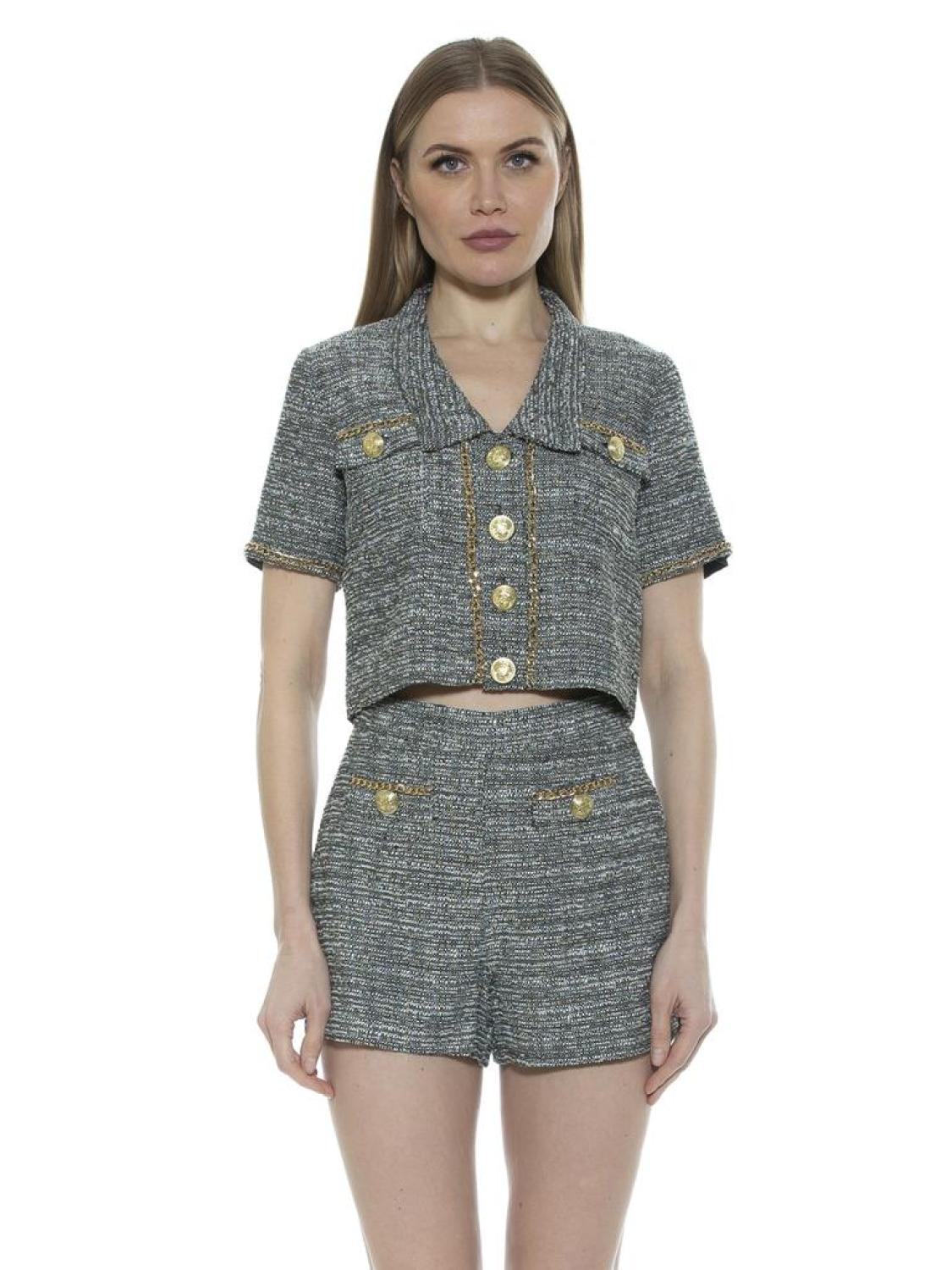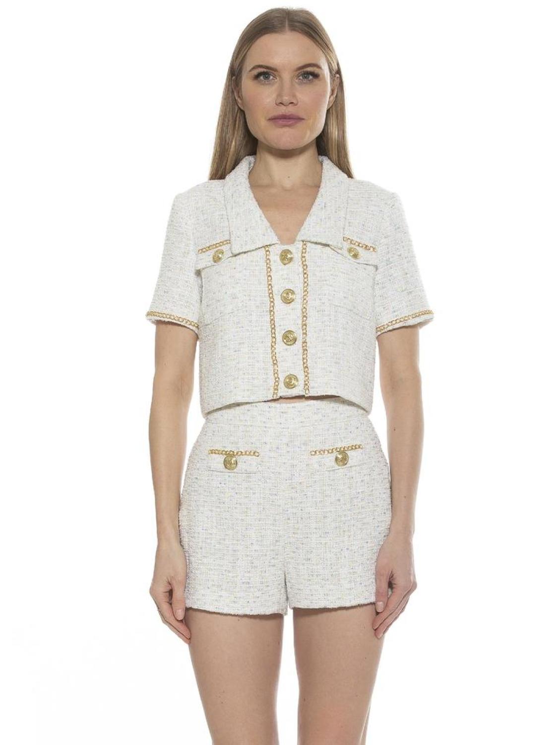 • We have a set for you. The Selena is a tweed short sleeve collared jacket. The jacket has a gold chain trim and gold button details. Pairs with the Justina Short PRODUCT FEATURES Split collar Short sleeves Front button closure Dual chest flap pockets Gold-tone trim Tweed construction 100% Polyester Lining - 97% Polyester, 3% Spandex Hand Wash Imported Style T586