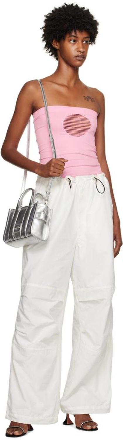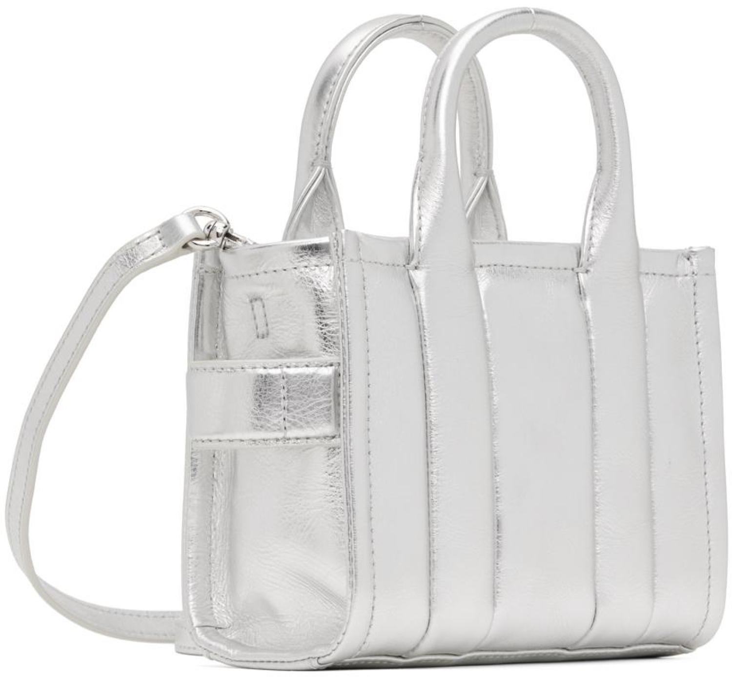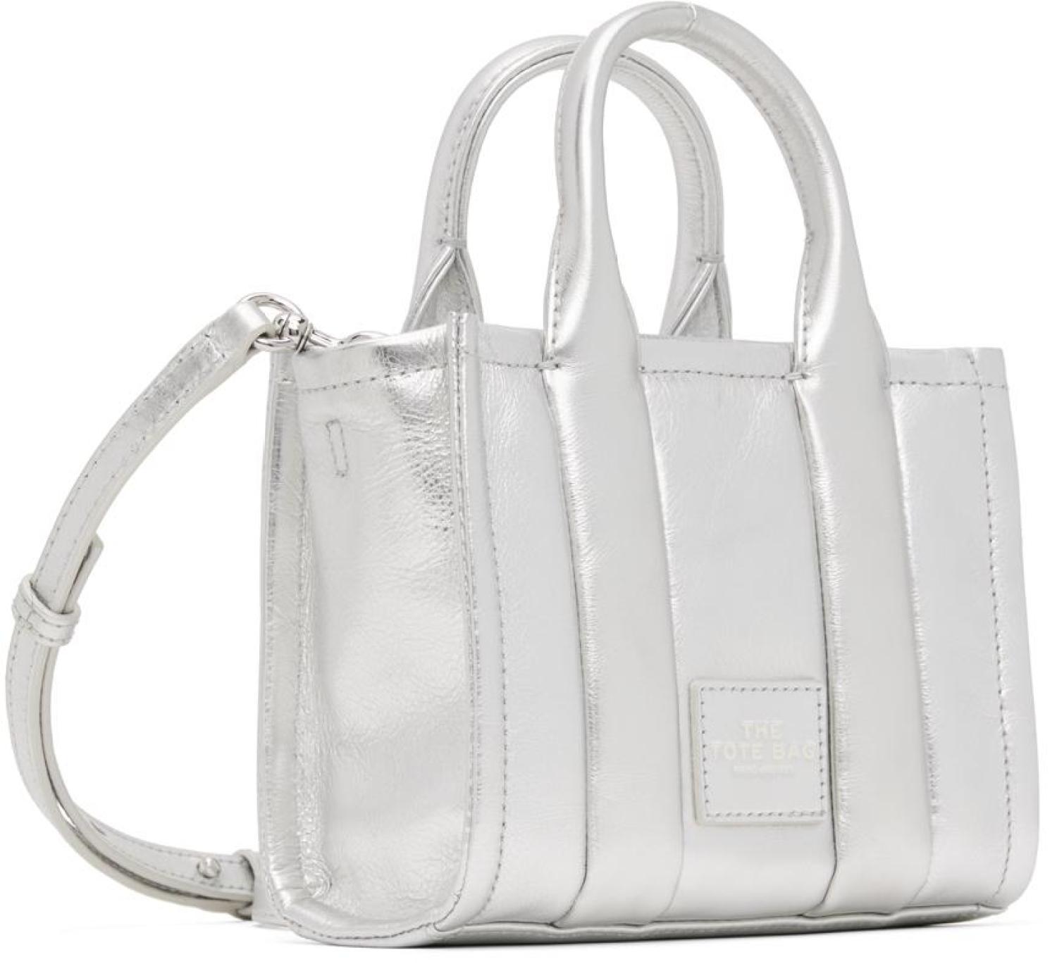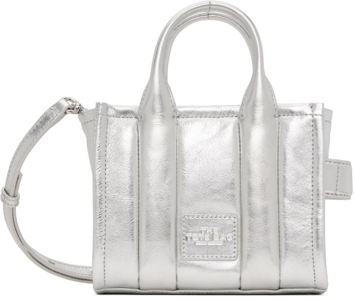 Marc Jacobs Silver 'The Shiny Crinkle Leather Mini Tote Bag' Tote Crinkled leather tote in silver-tone. Logo patch at face. · Rolled carry handles · Detachable and adjustable shoulder strap · Carry handle at side · Zip closure · Card slot at interior · Faille lining · H5.75 x W7 x D3.5 in Supplier color: Silver Leather. Made in Viet Nam. 232190F049166