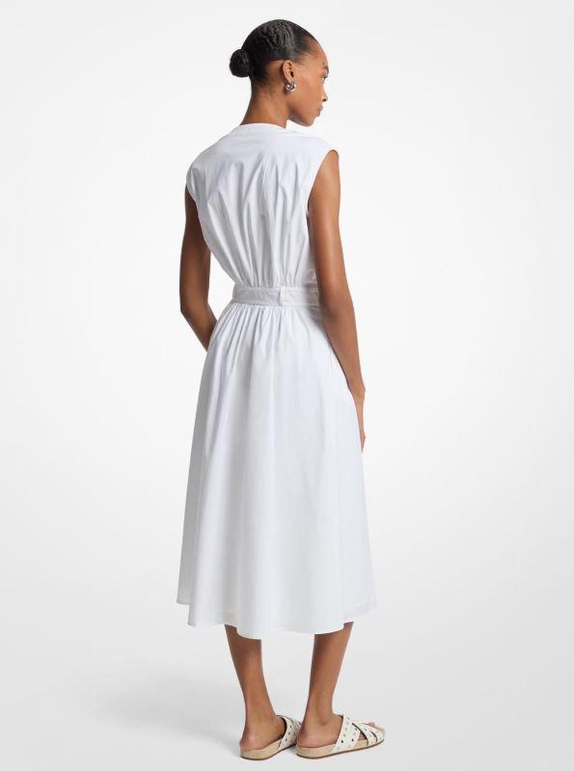 • The versatile dress for day, night, work—and beyond—is here. Crafted from cotton poplin with a touch of stretch, it features a deep crossover neckline and belted bodice that descends into a crisp circle skirt. Pair it with kitten heels and a mini bag for a ladylike look.
