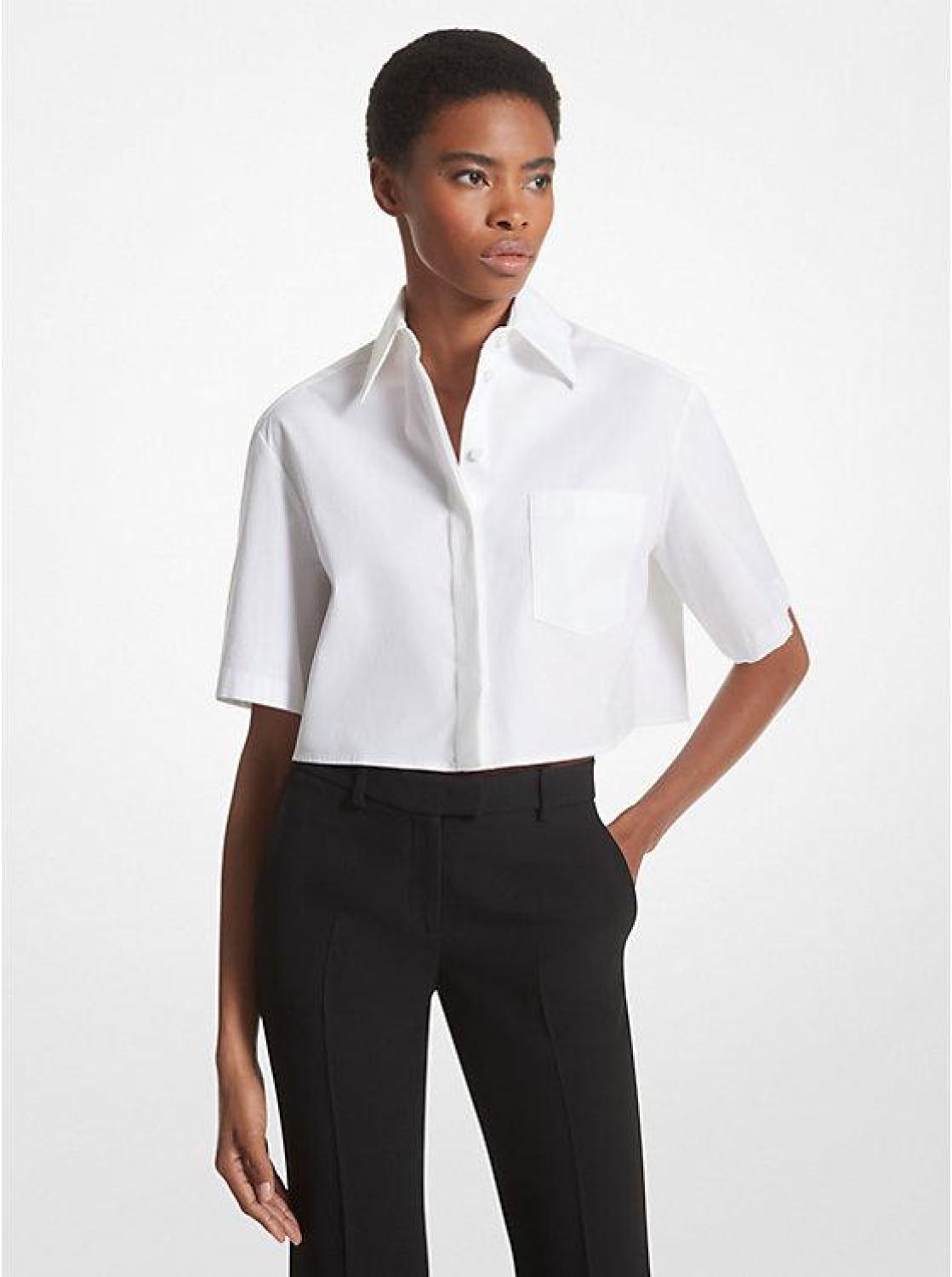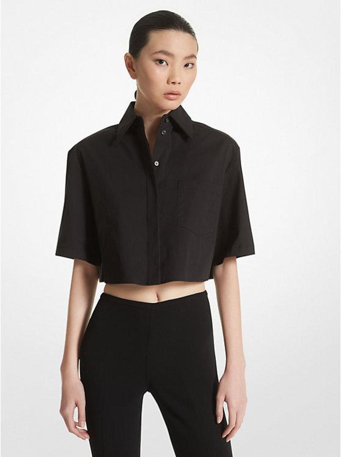 • Redefining dress codes, this collared shirt is cut from stretch cotton poplin and has a cropped hem that showcases the waist. A patch pocket and quarter-length sleeves complete the modern design. Leave a few buttons undone when styling it with a high-rise pant or legging.