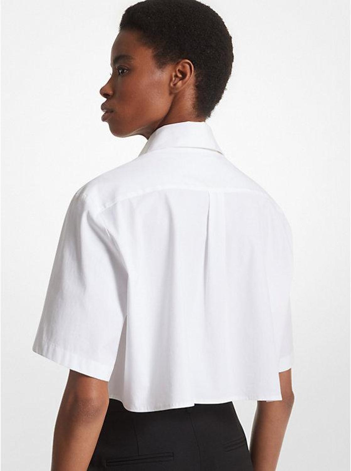 Redefining dress codes, this collared shirt is cut from stretch cotton poplin and has a cropped hem that showcases the waist. A patch pocket and quarter-length sleeves complete the modern design. Leave a few buttons undone when styling it with a high-rise pant or legging.