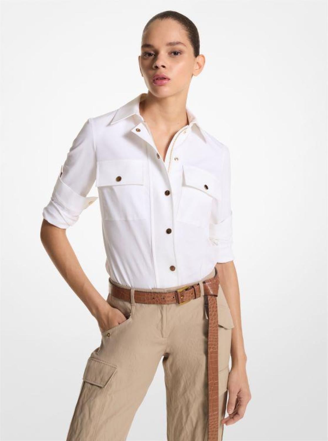 Utility styling—chest pockets and a zipper-and-button placket—infuses this shirt with a safari sensibility. Made in Italy from organic stretch cotton poplin, it’s a crisp, cool staple to team with chinos and denim alike. • Shirt • Stretch cotton • 96% cotton/4% elastane • Snap fastening • Dry clean • Made in Italy • Model is 5’10”/178 cm wearing US size 2 • Shirt • Stretch cotton • 96% cotton/4% elastane • Snap fastening • Dry clean • Made in Italy • Model is 5’10”/178 cm wearing US size 2