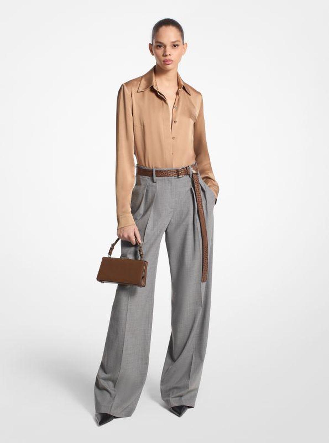 • These wide-leg trousers combine timeless tailoring elements, like front pleats and crisp leg creases, with stretch-infused virgin wool sourced from an Italian mill. A high-rise fit evokes a strong feminine aesthetic. Balance its soft hand and languid drape with pointed-toe heels. Made in Italy.