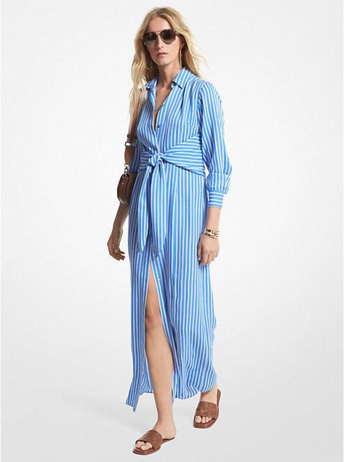 • It doesn’t get easier, or breezier, than this striped maxi shirtdress. Decorative ties at the waist create a softly draped look, while the pointed collar and buttoned cuffs add polished appeal. Leave a few buttons undone in the front to create an open slit for ease of movement.