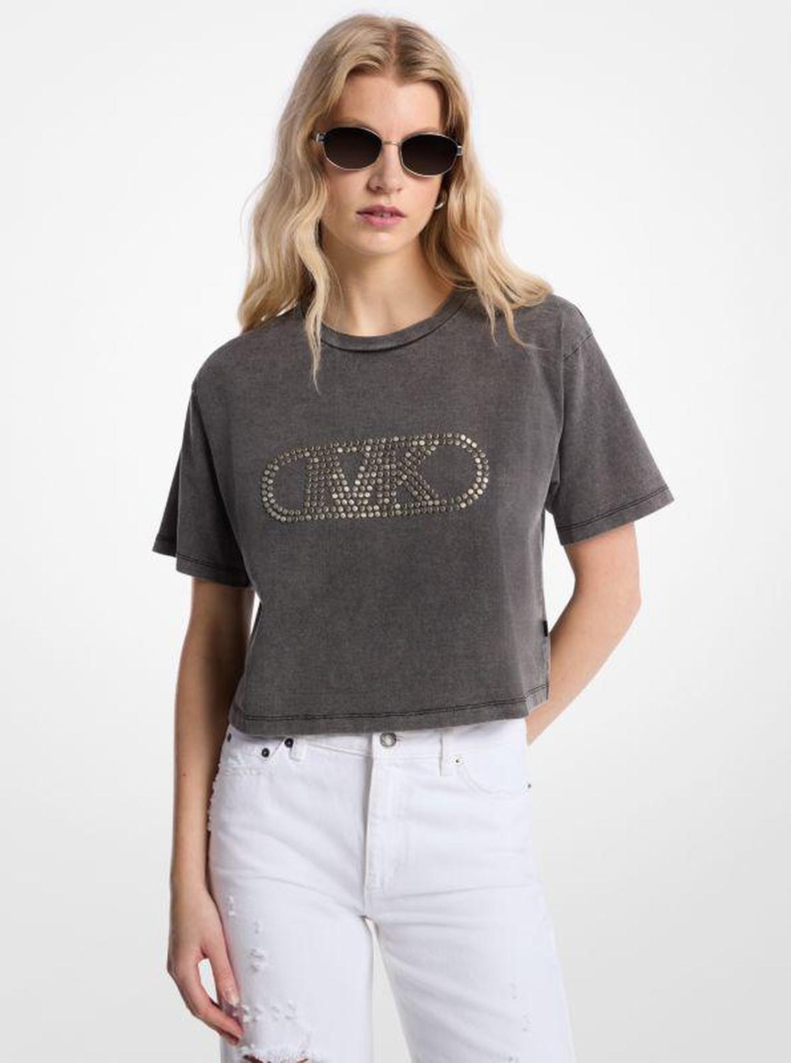 Studded Garment-Dyed Cotton Cropped T-Shirt