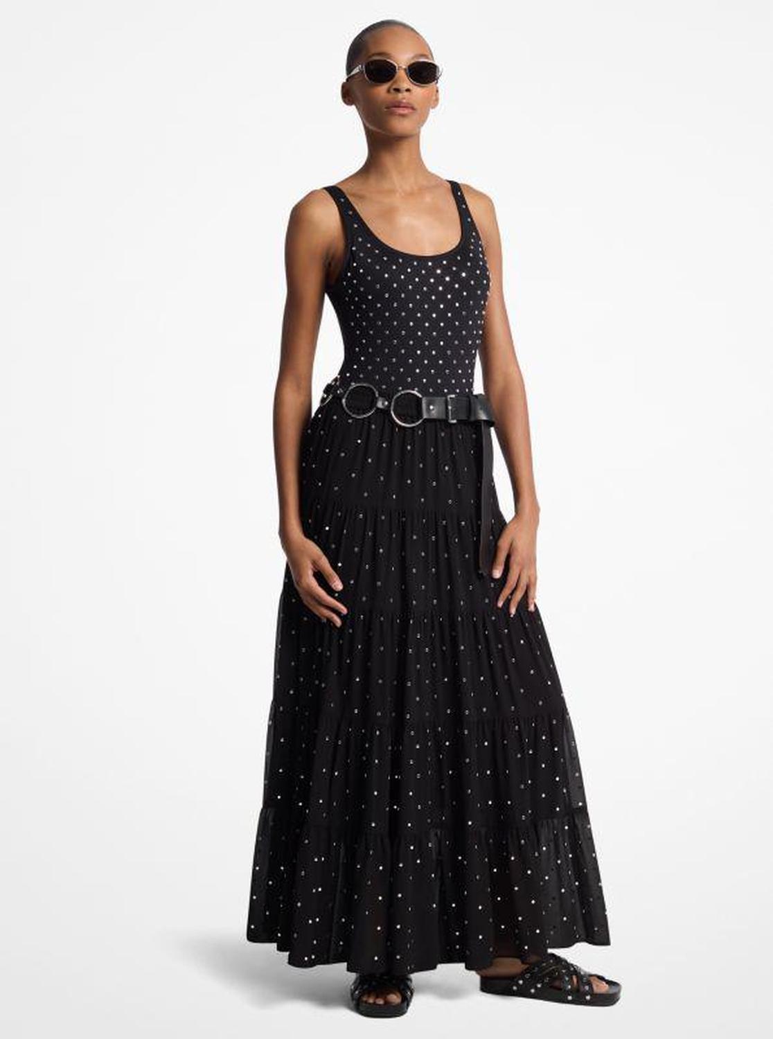 Look chic in the heat with flattering swimwear that can easily double as a bodysuit. This minimal one-piece is cut from smooth stretch nylon embellished with shining silver-tone studs. A low, scooped back and high-cut legs add to its glamorous feel.