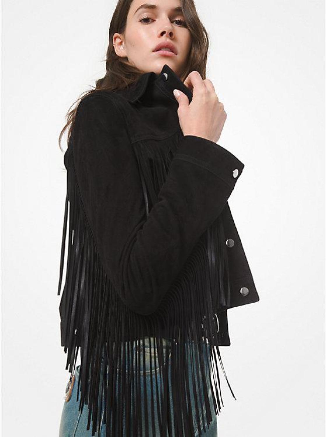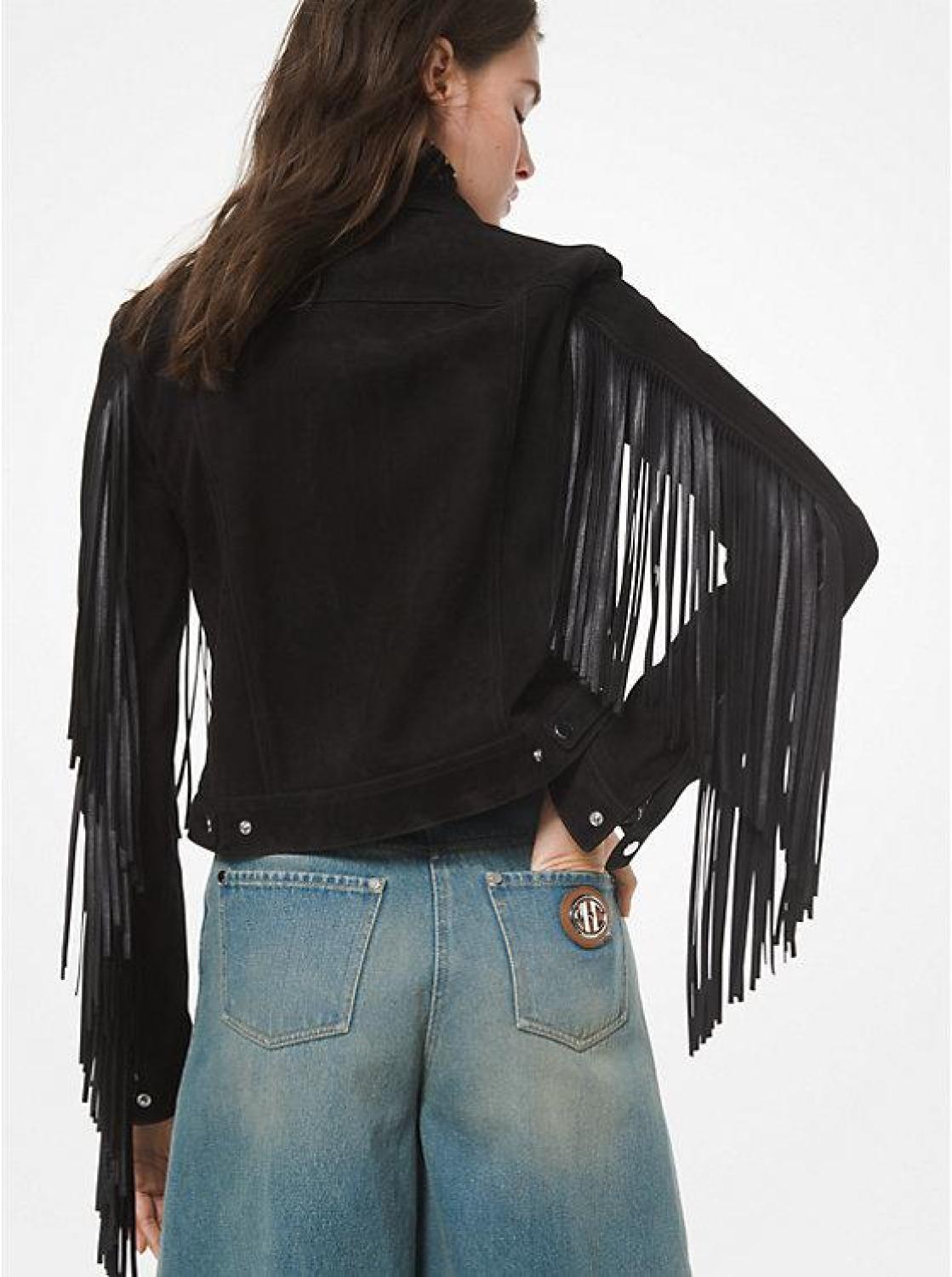 A novelty spin on the perennial outerwear classic, this jean jacket showcases meticulous Italian craftsmanship in rich suede. Tiers of leather fringe add eye-catching statement, while a smooth satin lining ensure it will layer over tailoring and knits alike. Channel a Western-chic vibe by pairing it with a tie-neck blouse and gauchos.