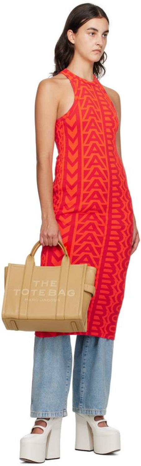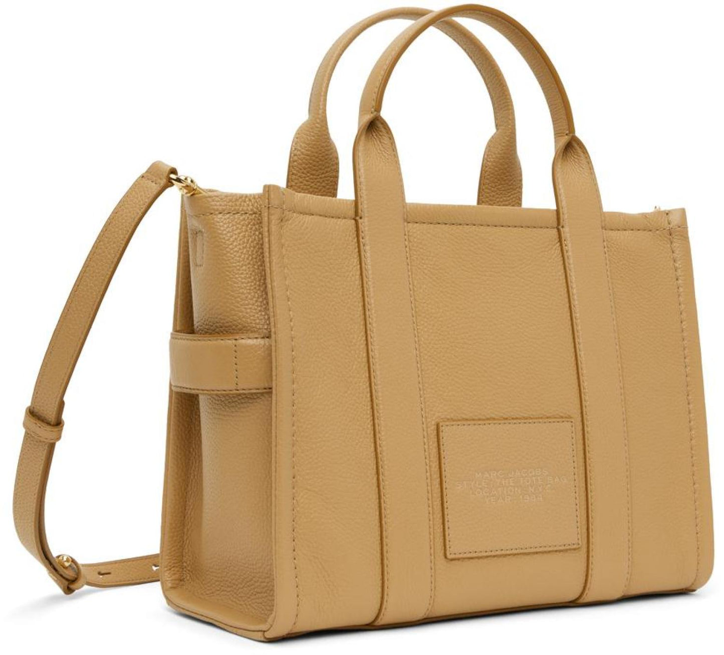 Marc Jacobs Tan 'The Leather Medium Tote Bag' Tote Grained leather tote in tan. · Rolled carry handles · Adjustable and detachable shoulder strap · Logo embossed at face · Carry handle at side · Logo patch at back face · Leather pads at base · Zip closure · Zip and patch pocket at interior · Card slot at interior · Twill lining · H11 x W13 x D6 in Supplier color: Camel Leather. Made in Viet Nam. 232190F049150
