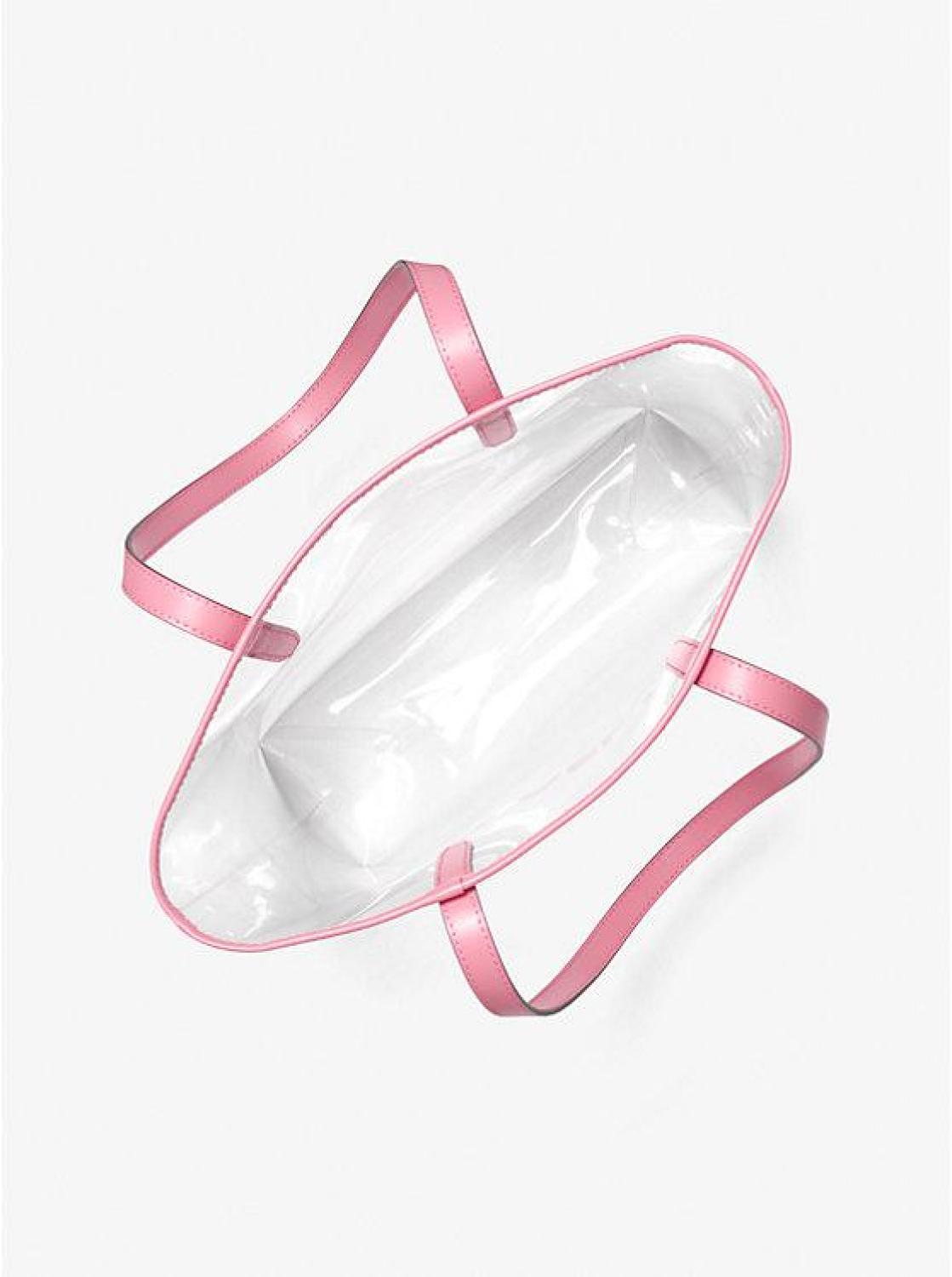 • A minimalist silhouette with so-now appeal, The Michael tote bag is crafted from crystal-clear vinyl and printed with our logo in block lettering. A detachable logo charm lends a sophisticated finish.
