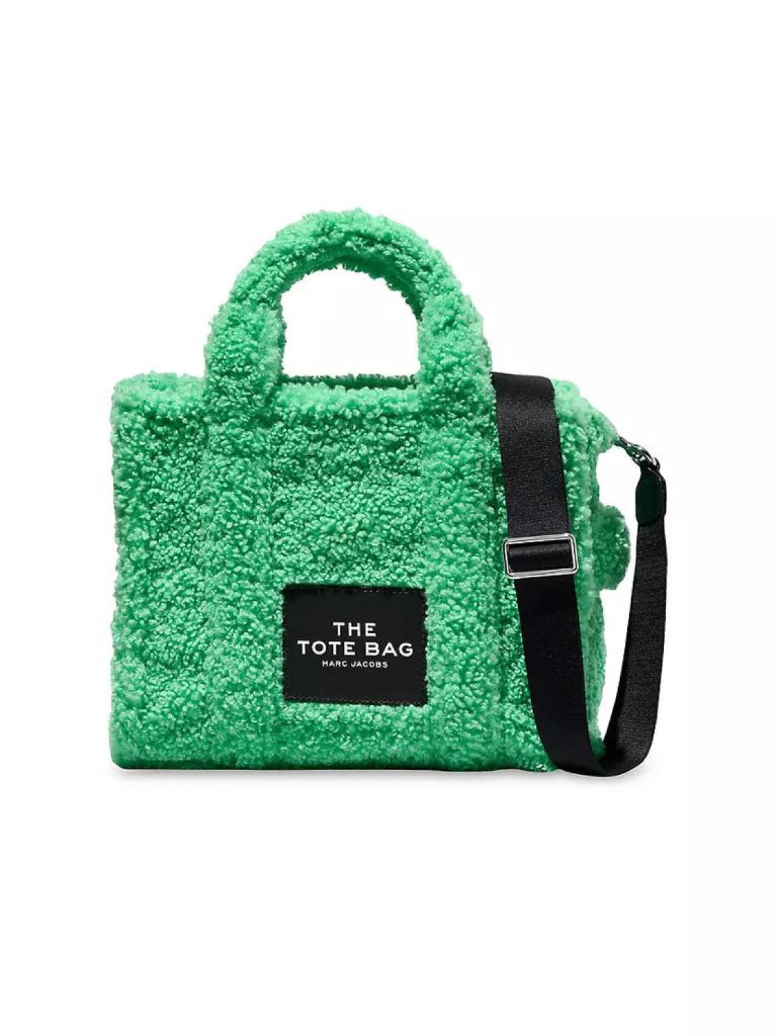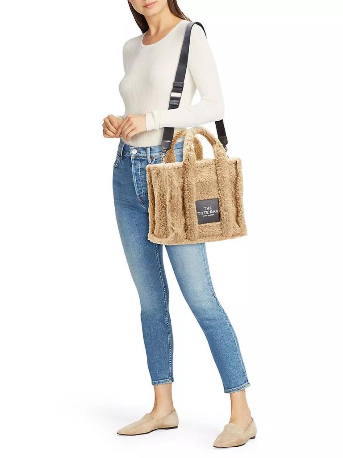 • Convertible tote in a plush *faux fur* finish can be worn over the shoulder or carried by hand.