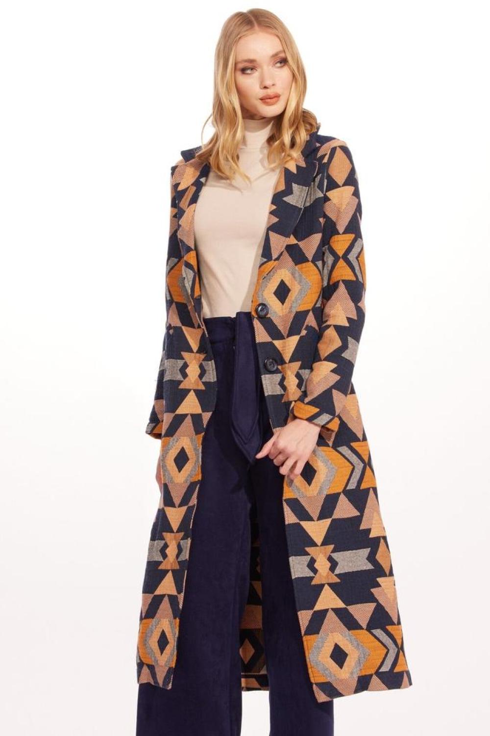 • Elegant and cozy all at once this is the perfect cotton jacquard coat that is ideal for layering up this fall season. Lightweight and woven in France, our Trent coat has two front welt pockets and two large button closures. Two-button front closure Tailored silhouette Longline Fits true to size Not lined Cotton blend Made in USA Â