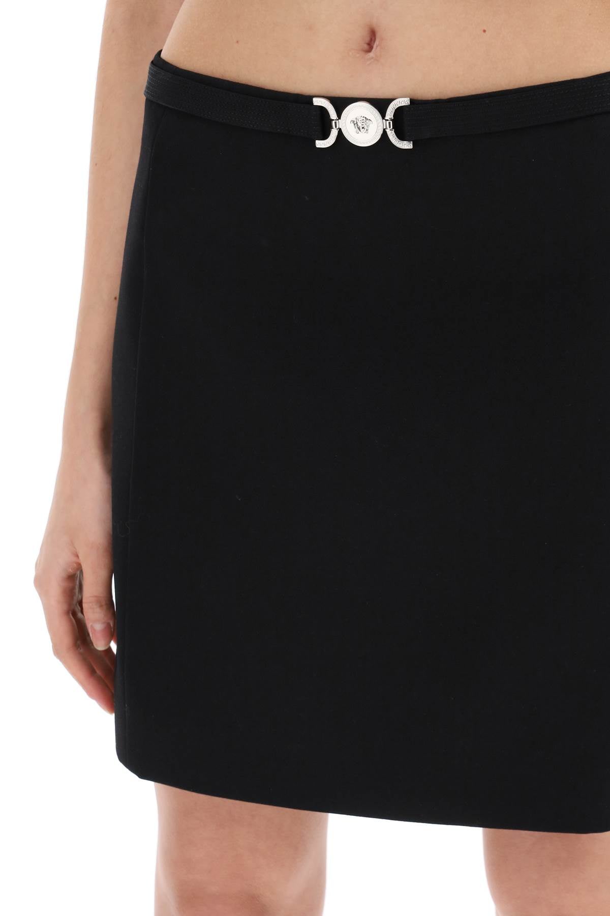 • This Versace miniskirt is made of virgin wool grain de poudre and features an integrated belt with stitched satin detailing. It is adorned with a silver metal Medusa '95 detail. The skirt has an invisible back zip and hook closure, and is lined with Barocco jacquard fabric. Its regular fit is cut in a trapeze shape. The model is 177 cm tall and wears an Italian size 40.
