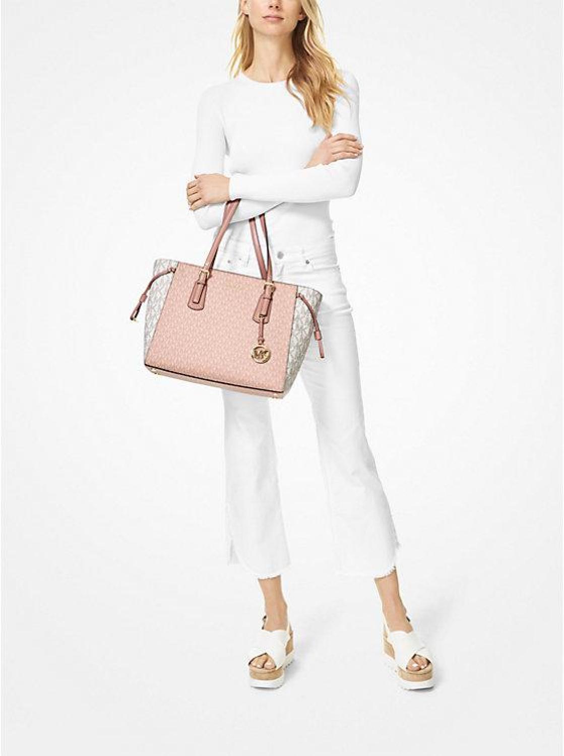 Crafted in color-blocked logo print, the Voyager tote bag features adjustable shoulder straps and gusset ties for everyday versatility. Its signature design promises everlasting appeal, while refined hardware lends a sophisticated finish.
