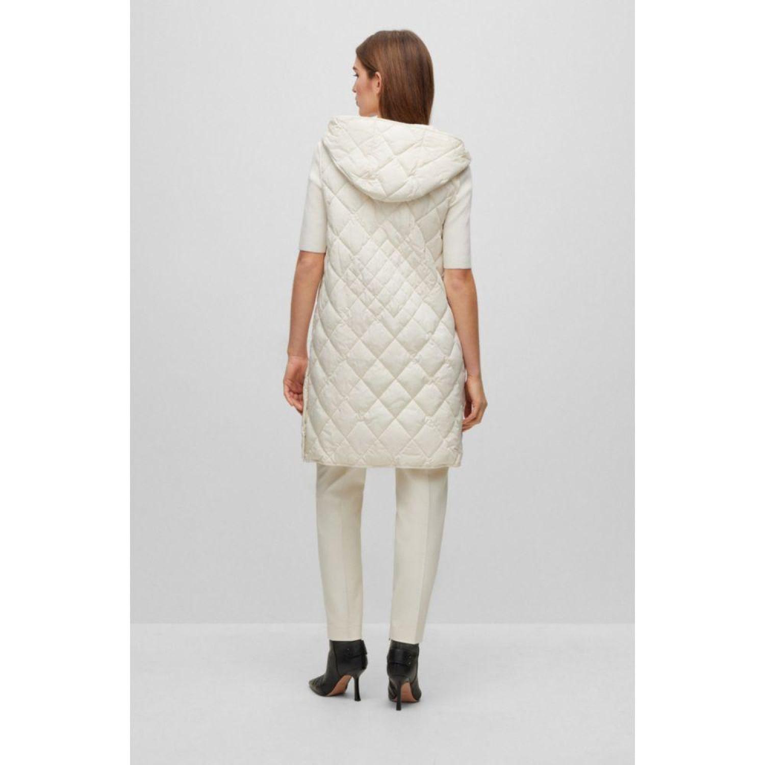 A hooded gilet in quilted, water-repellent material with branded poppers at the front and sides by BOSS Womenswear.