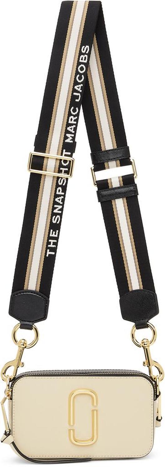 Marc Jacobs White & Black 'The Snapshot' Shoulder Bag Saffiano leather shoulder bag colorblocked in white and black. · Adjustable and detachable nylon webbing shoulder strap · Logo hardware in at face · Patch pocket at back · Twin zippered compartment · Patch pocket at interior · Twill lining in grey · H4.25 x W7.25 x D2.5 in Supplier color: New cloud white Leather. Made in Viet Nam. 221190F048004