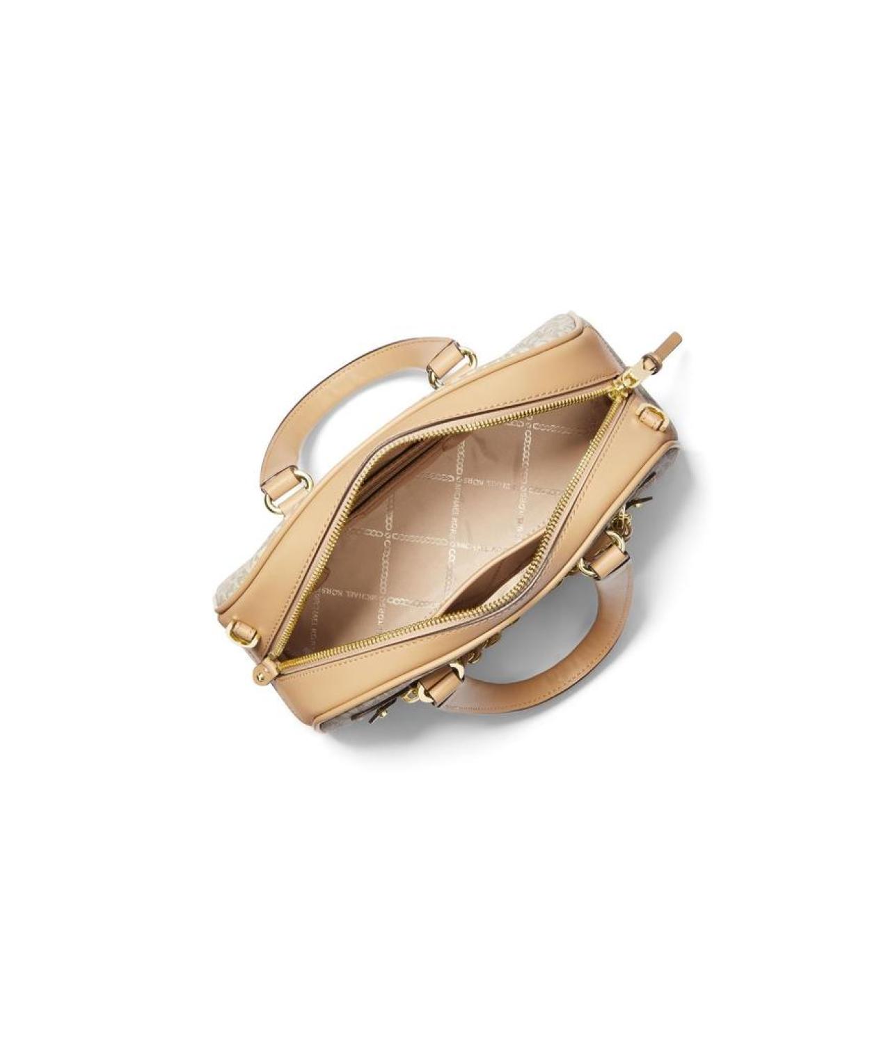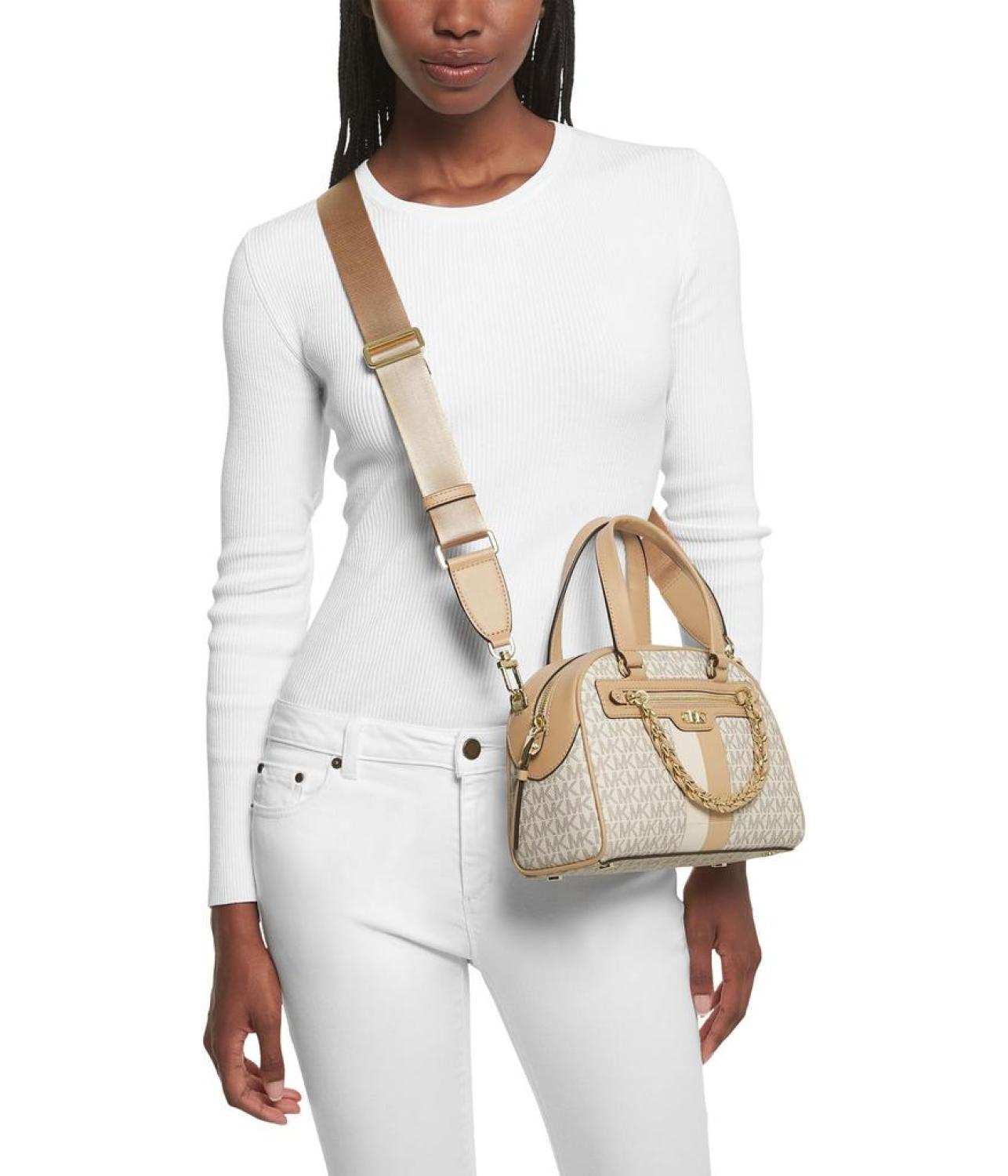 Add a touch of glamour to your look carrying the MICHAEL Michael Kors® Williamsburg Small Bowling Satchel. Designed for the modern woman, crafted from leather, it features allover iconic brand print with one zippered pocket on the front. This state handbag has dual carry handles with detachable crossbody strap.