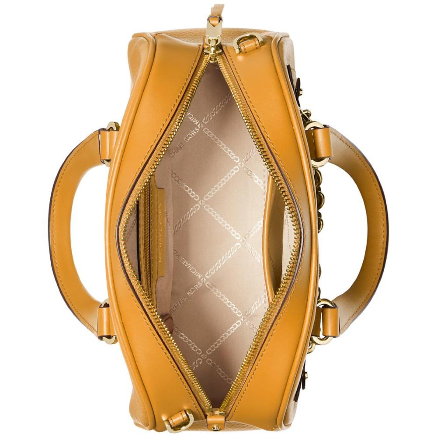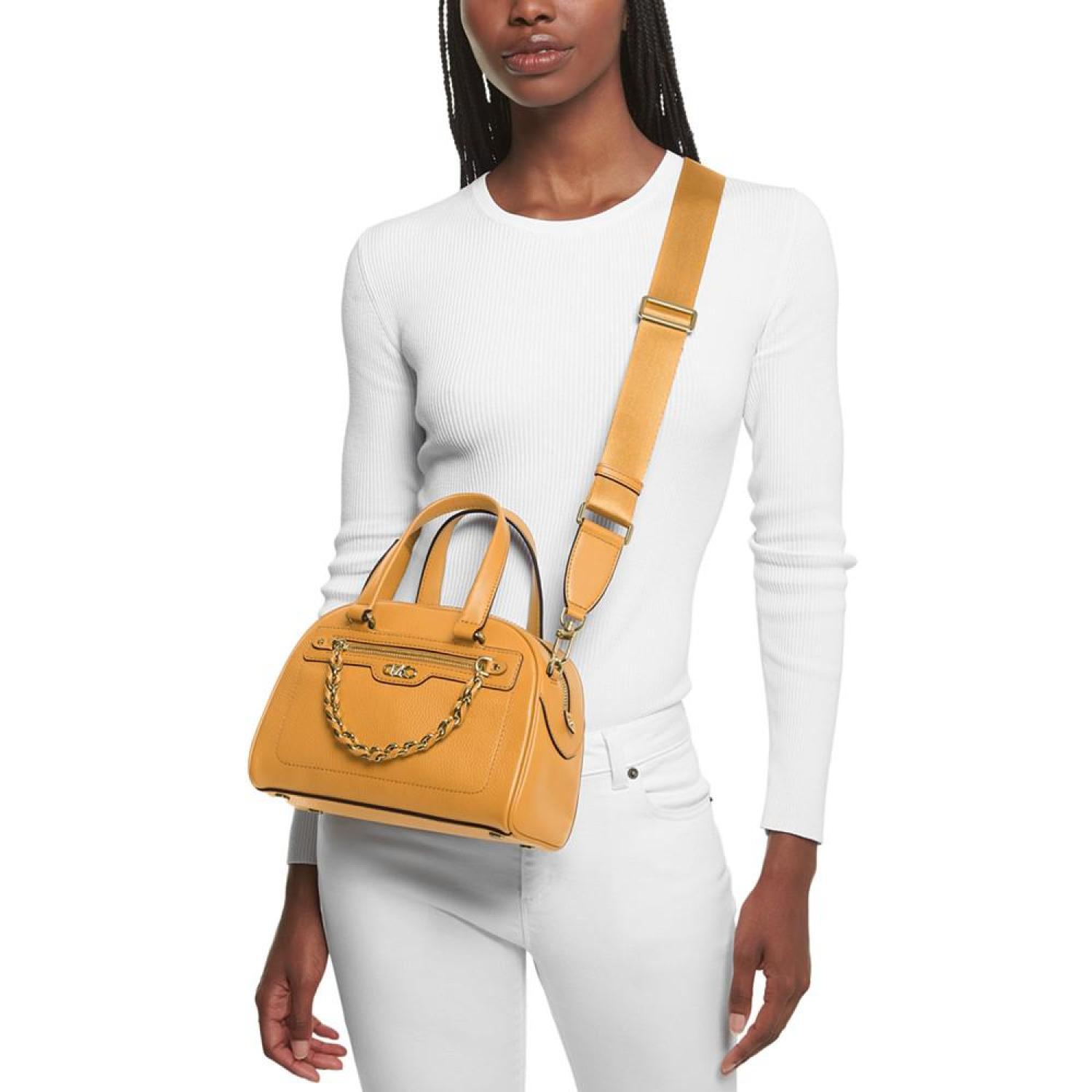 Your style will be a strike with the Williamsburg Small Leather Bowling Satchel by MICHAEL Michael Kors. Small sized bag; 10-1/4"W x 7"H x 4-3/4"D (width is measured across the bottom of handbag); 1.37 lbs. approx. weight Silhouette is based off 5'9" model Fixed top handles; 22"L strap Zippered closure Gold-tone hardware & exterior front zip pocket Interior zip & slip pockets Leather; trim: polyurethane, cotton, polyester; lining: polyester Spot clean Imported