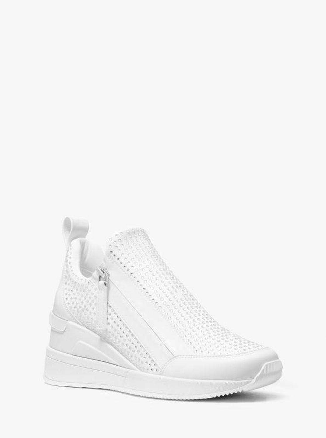 • Defined by allover crystal-embellishments, our Willis wedge trainer will kick any look up a notch. This pair is crafted from stretch knit for a breathable fit and feel, while a zip fastening makes them easy to slip on and off. Wear yours with coordinating athletic separates for a casual-cool look.