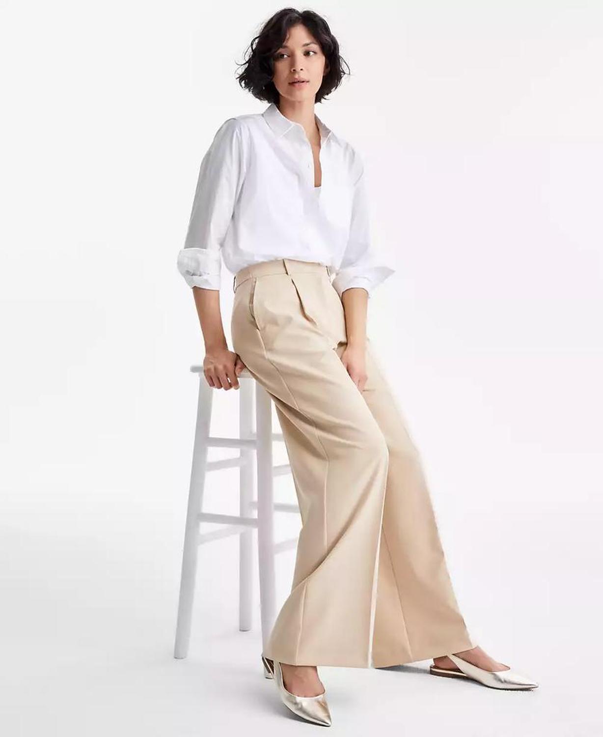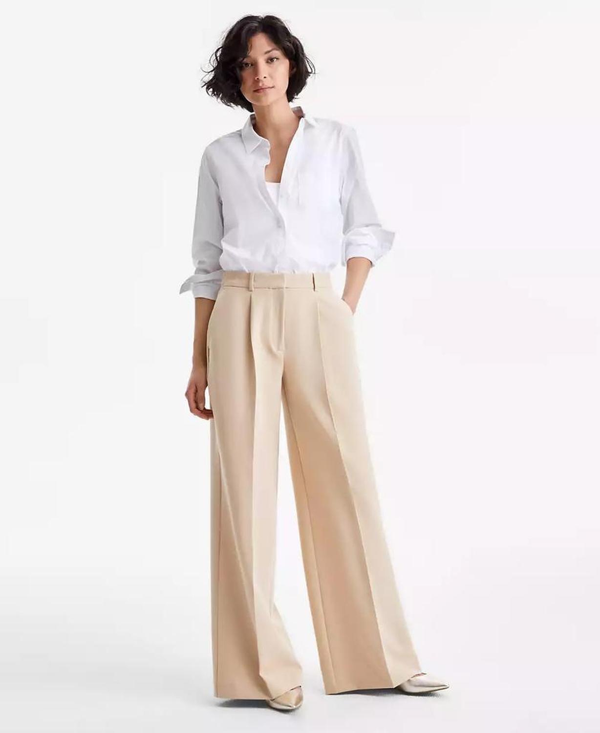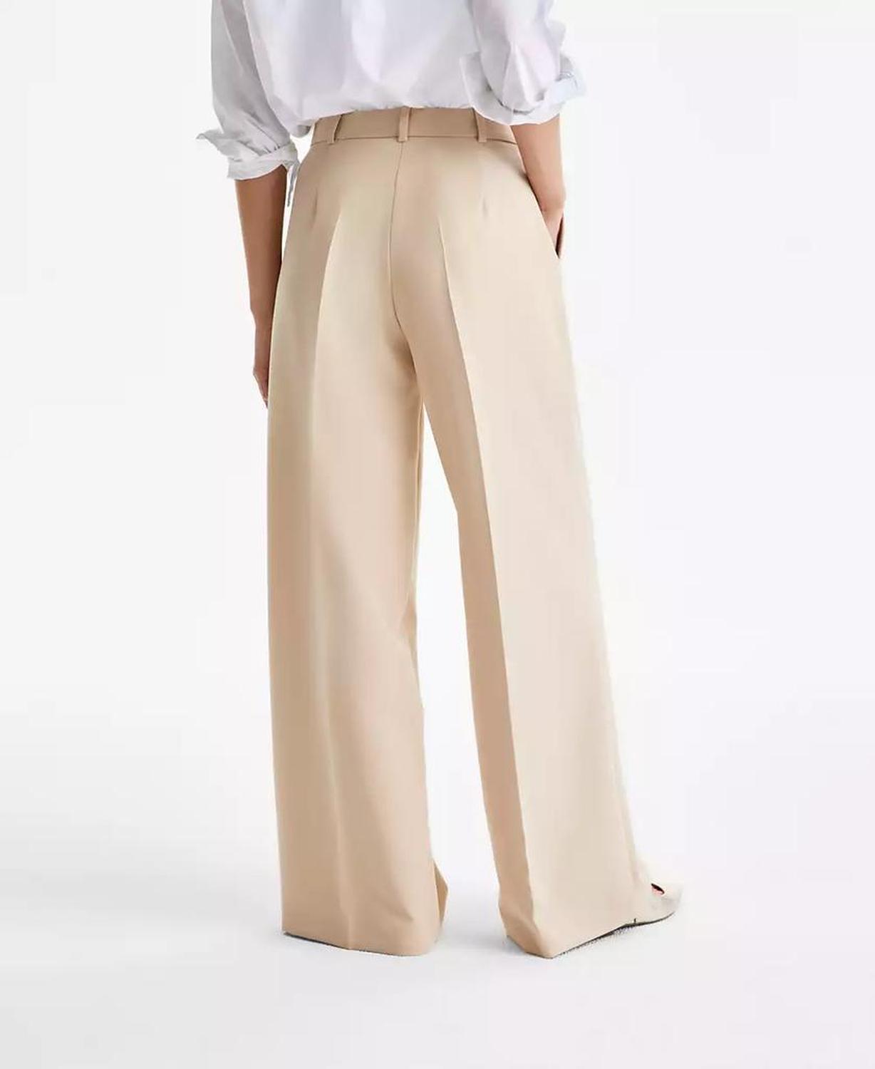 An iron crease at the front lends a perfect polish to these full and flowing wide leg pants by BOSS Orange, the perfect statement to endless ensembles. Approx. inseam: 32-7/10" High rise; approx. leg opening: 26-4/5"; wide leg Zipper and button closure at front Creases at front Two pockets at side seams 87% polyester, 13% elastane; pocketing: 100% polyester Machine wash Imported