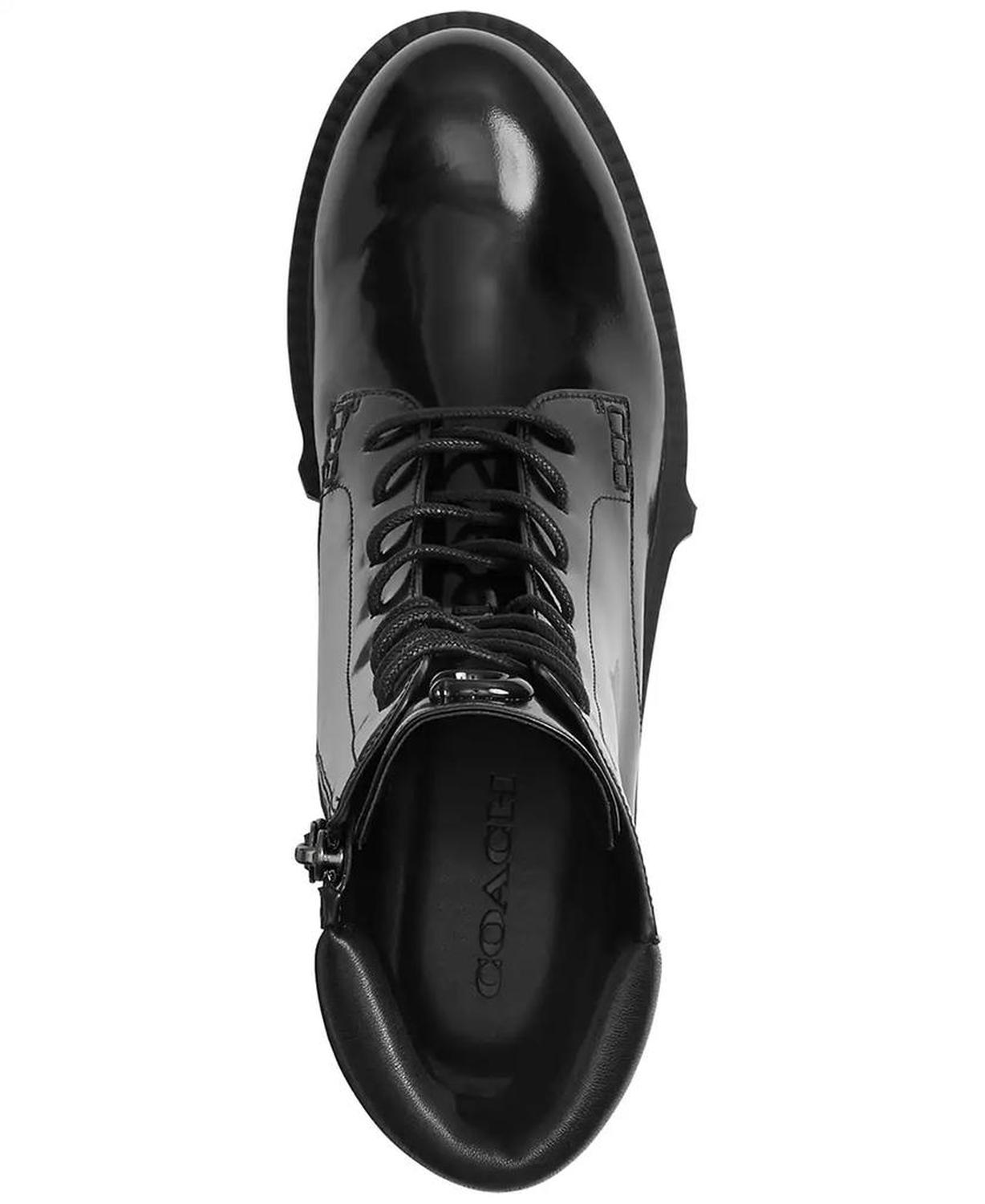 • Patent polish elevates a rugged combat feel in the lace Leighton booties from COACH.
